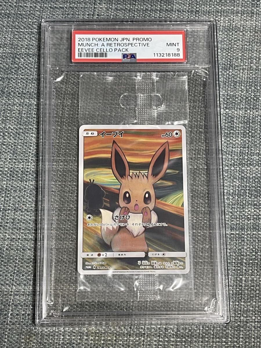 ムンク展プロモカードのイーブイのパック鑑定PSA9です。スニダンA品の美品を購入して、パック鑑定に出しました。カード自体は未開封で極美品だと思います。センタリングも良好で中身のカードを取り出しカード自体を再鑑定かけるのもお勧めです。