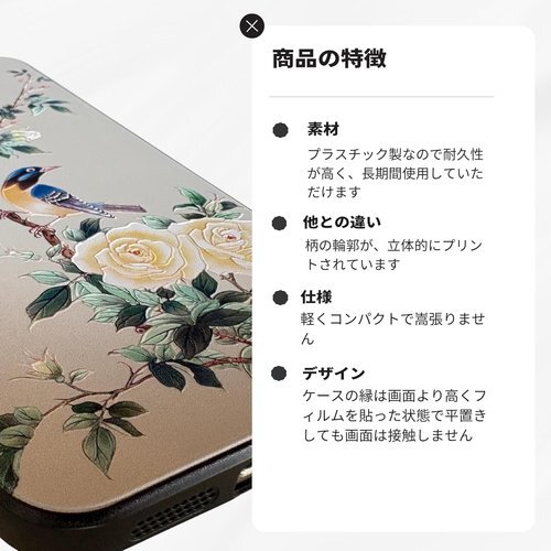 【柄】 背景はベージュ色です。木に鳥が止まった中国柄のスマホケースです。中国で鵲は吉祥のシンボルです。