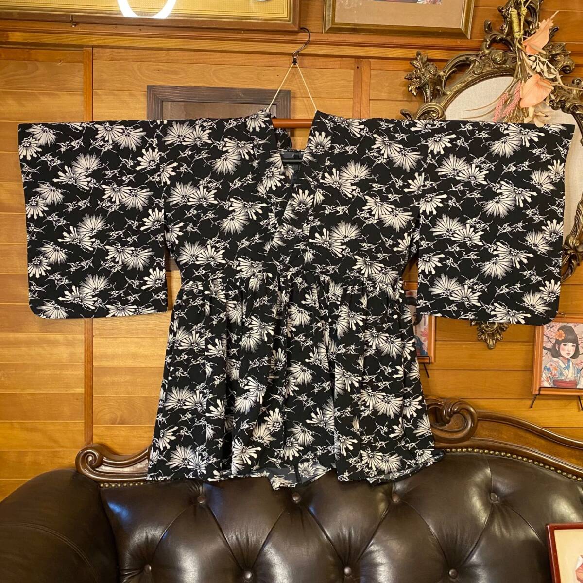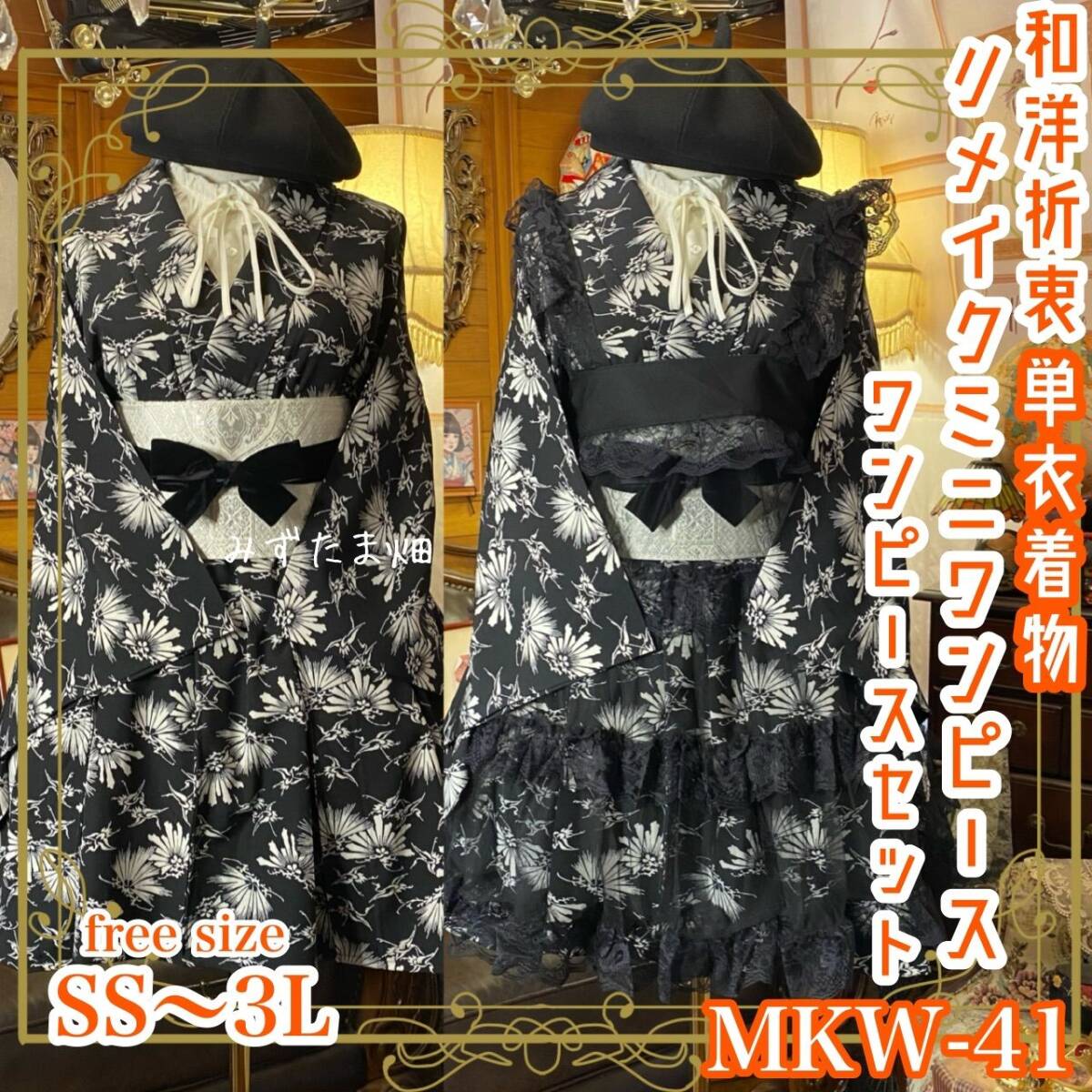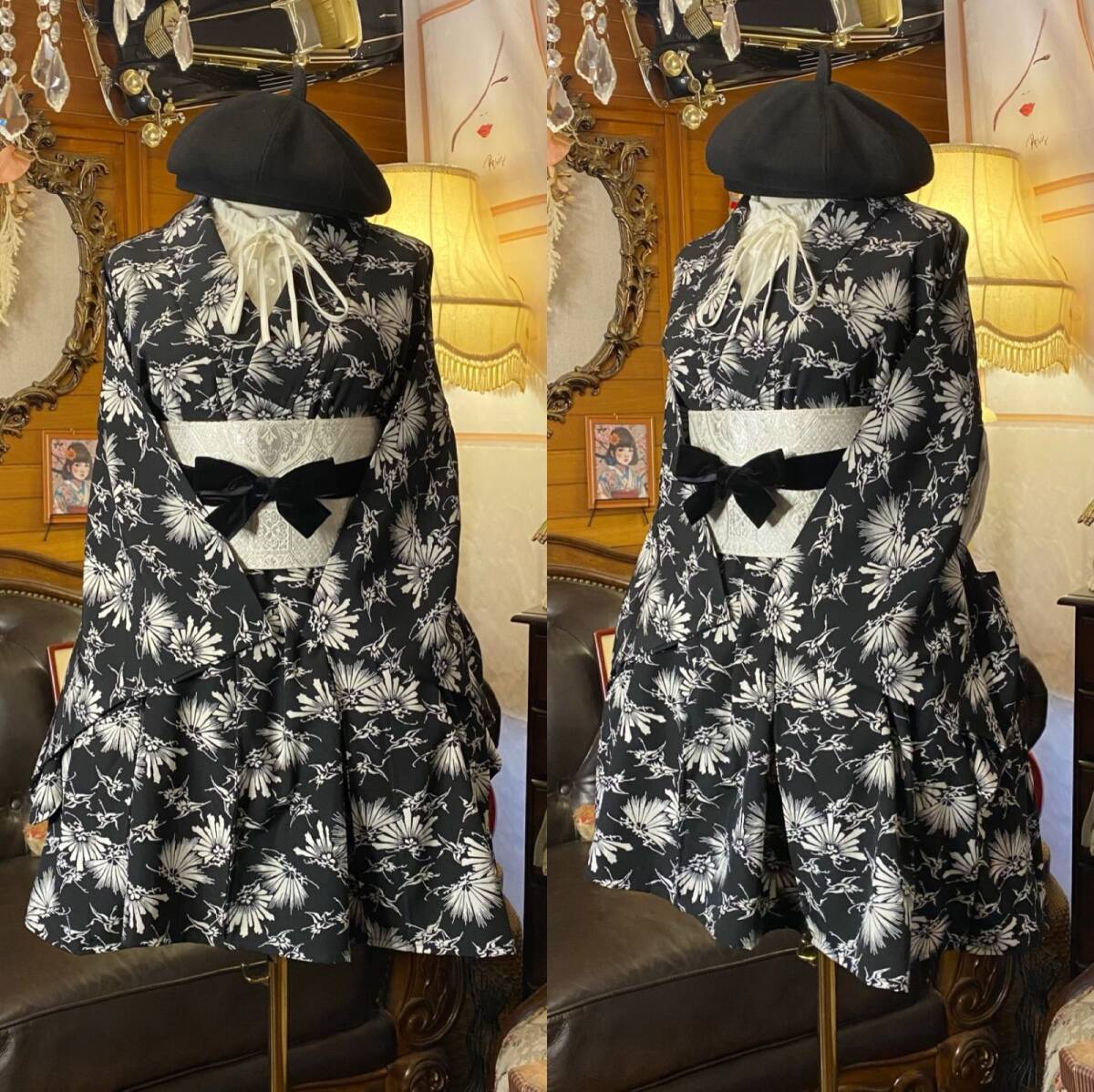 【 着物 ミニ丈 ワンピース ドレス 和ロリ 2部式作り帯 京袋帯 お太鼓 リメイク 和洋折衷 洗える 化繊 ハンドメイド レトロ 古着 単衣 freeサイズ 黒に咲く気高き羽音 MKW-41 】
