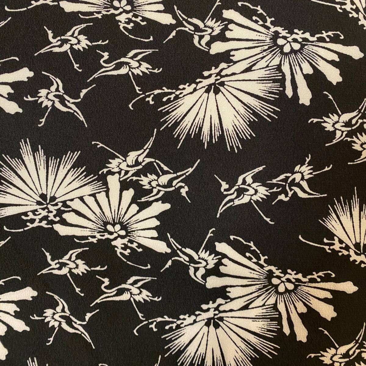 大胆な黒のコントラストに映えるのは、花びら一枚一枚の繊細な線と、鶴の優雅な曲線。これはただの柄ではなく、まるで一幅の水墨画をそのまま身に纏っているかのような美しさ。