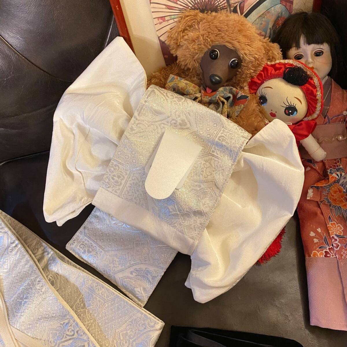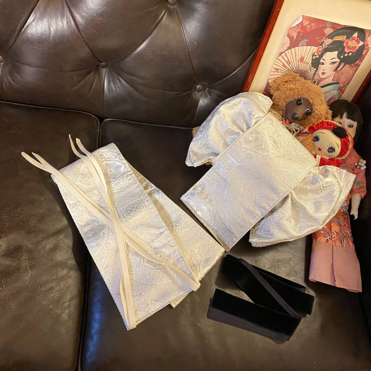 コーディネートでは、シルバー地の帯とベロアのリボンベルトでシルエットにメリハリを加え、洗練されたクラシカルロリータな印象に。レースフリルエプロンの重ね着を施せば、まるで黒天使のような幻想的な佇まいに変化し、着こなしの幅は無限大。
