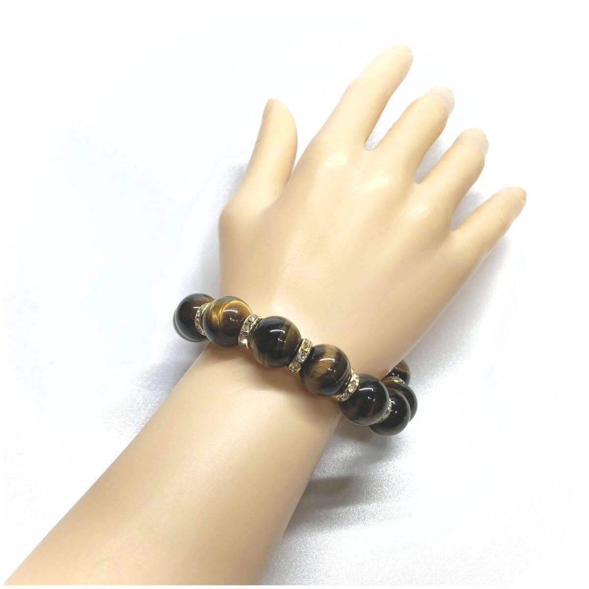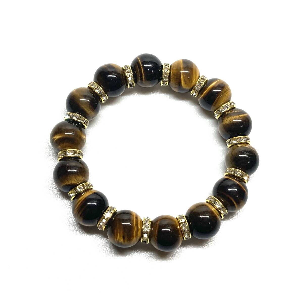 こちらは、14mm玉のタイガーアイを使用した天然石ブレスレットです。石との間にはロンデルを挟み高級感を演出しています。シンプルなデザインですのでどんなコーディネートとも合わせ易いブレスレットです。石大きさは14mm玉です。内周約17cmです。パワーストーンを付けてる方へのプレゼントにもお勧めです。14mmサイズのリクエストが多々ありましたので少量ですが販売しました。気になる方はお早めにどうぞ。