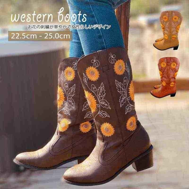 レディース 靴 ブーツ エスニック 太ヒール ミドル ウエスタンブーツ 刺繍 ハーフ カウボーイ 42 ライトブラウン