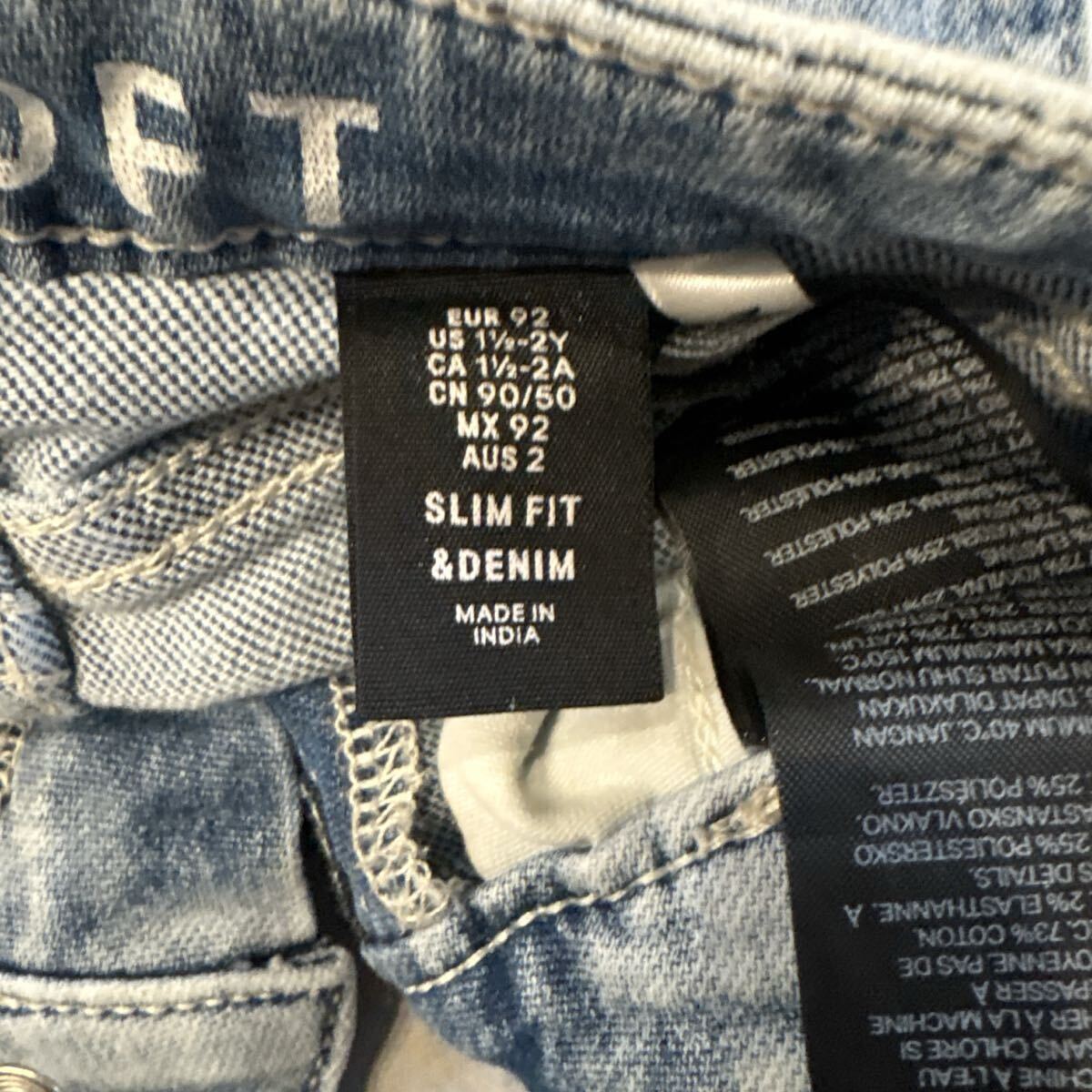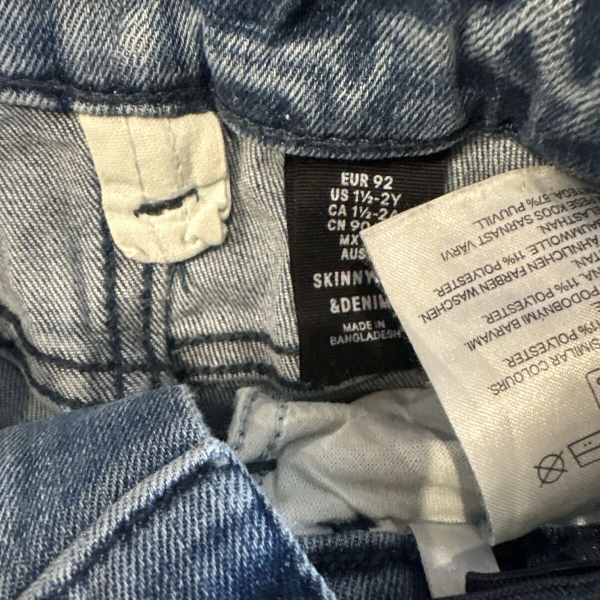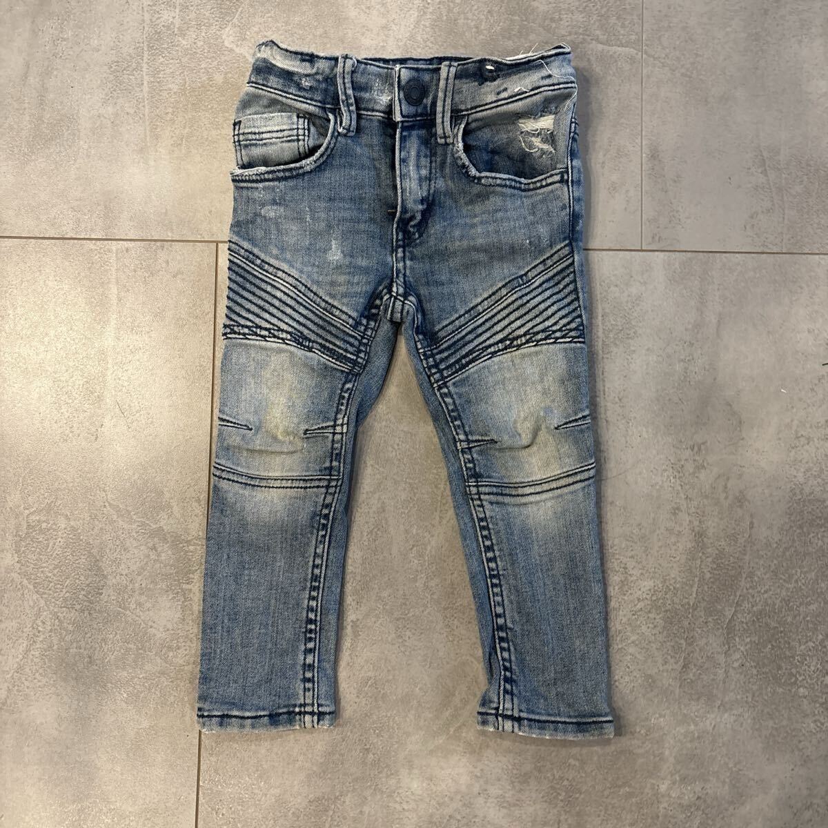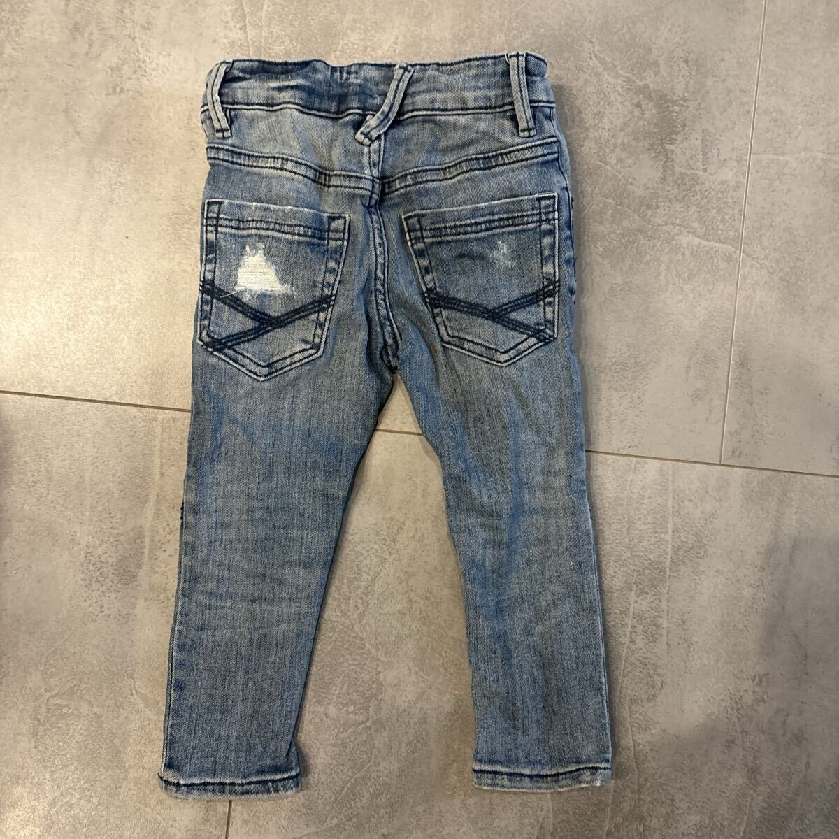 ライトブルーのスキニージーンズ、ダメージ加工あり。