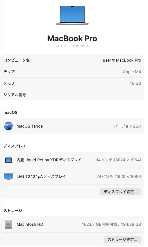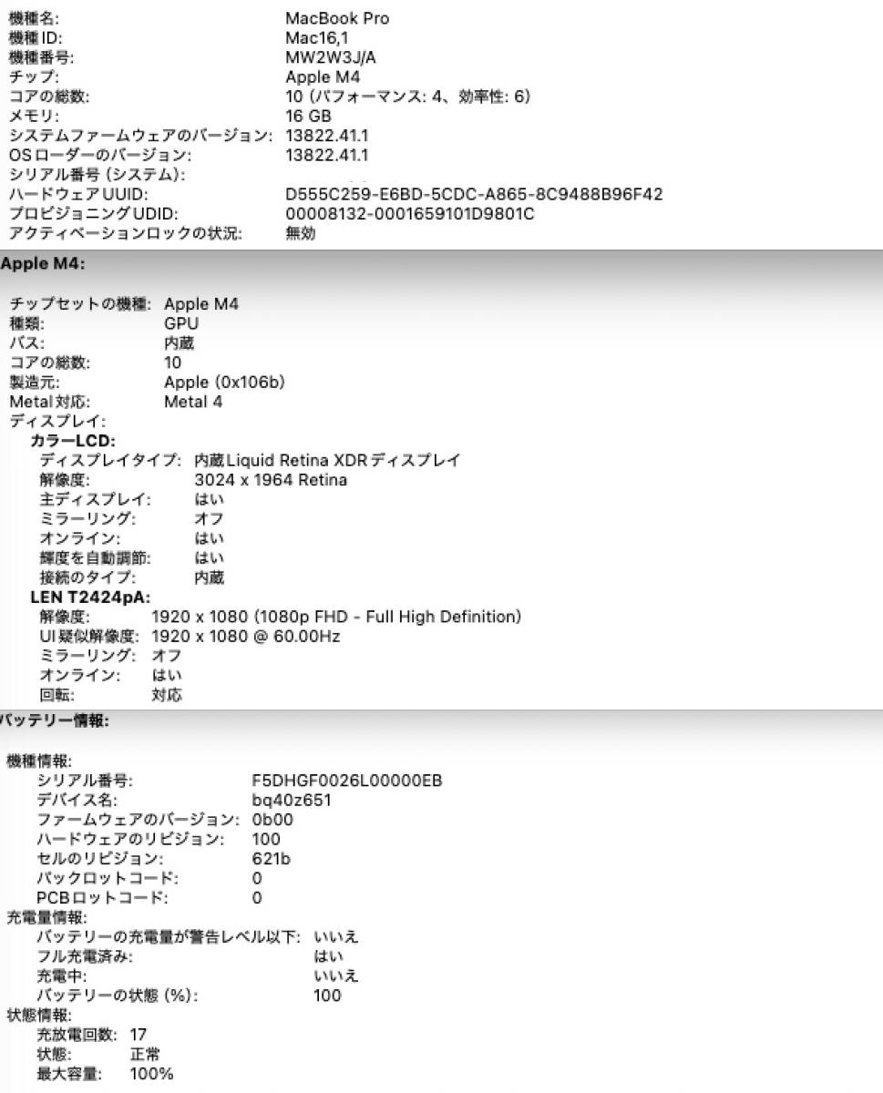 「ジャンク品」Apple Macbook Pro 2024/ Apple M4 / 16GB / 512GB / 14インチ シルバー、A3112