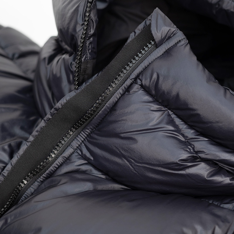 着丈、包み込むハイネックデザインのフード、袖口、裾をゴム仕立てにするなど、