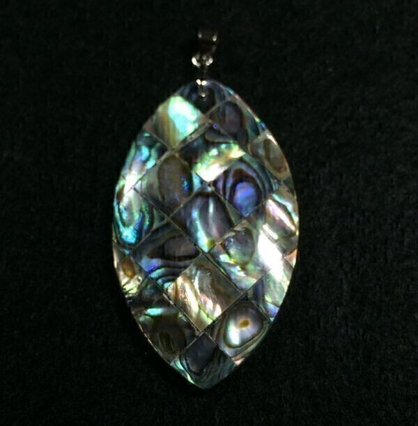貝殻の裏側のいちばん美しい部分を薄く削り、緻密に組み上げたリーフ型のペンダントです。金具付属、チェーンはありません。いちばん美しいプレシャスオパールに負けないくらい美しいです。光を当てる角度でお色が変化します。見ていてニヤニヤ。飽きないです。