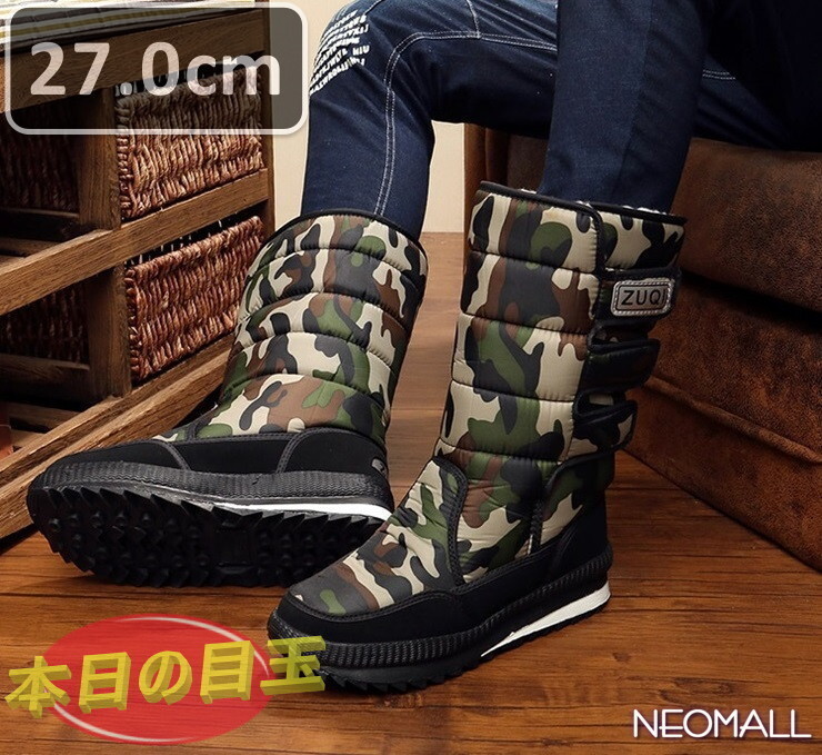 メンズ スノーシューズ 【866】 27.0cm グリーン迷彩 ムートンブーツ スニーカー ウィンターブーツ 裏起毛 防水 防寒 防滑 冬用靴 綿靴