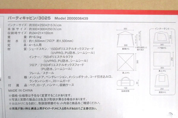 | 内 容 | ■コールマン パーティキャビン3025 テント(2000036439) ■サイズ: ・インナーサイズ/約300×250×H215cm ・本体サイズ/約300×300×H250cm ・収納時/約24×21×100cm ■仕様:メッシュドア、ベンチレーション、メッシュポケット、 コード引き込み口、ランタンハンガー、ストームガード ■重量:16.5kg ■耐水圧:約1500mm ■定員:4-5人用 ■付属品:ペグ、ロープ、ハンマー、収納ケース ■カラー:オリーブ ◆参考価格 39800円相当 広げるだけの簡単組立 吊り下げ式テントで日中はシェードとして 夜はテントとして使用可能 垂直に立ち上がった広々室内空間 横窓装備で通気性抜群の3面メッシュ 天井の大きなベンチレーションで熱気を解放して涼しく |