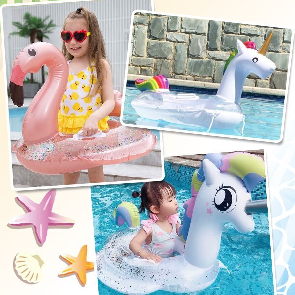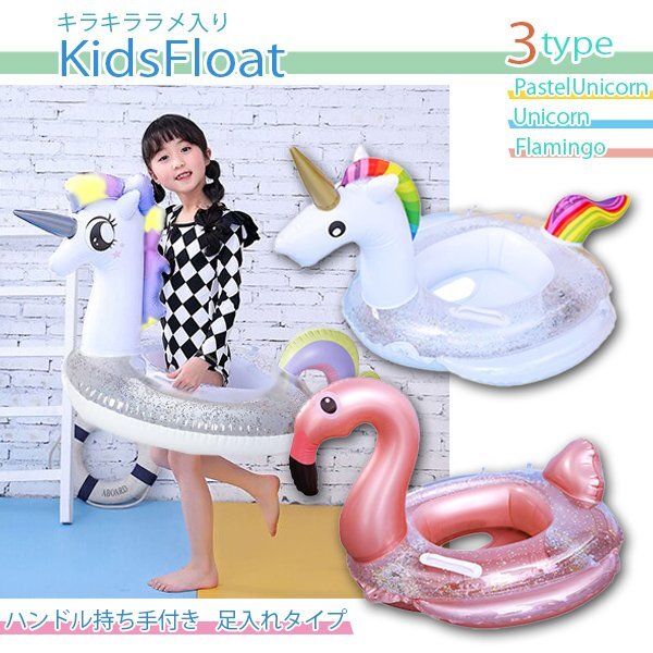 送料無料 ラメ入り キッズフロート持ち手付き 取っ手 赤ちゃん 足入れ 浮き輪 浮輪 うきわ 子供用 海 ベビー フラミンゴ ユニコーン
