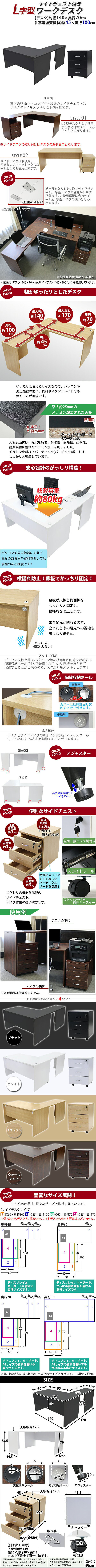 | 商品サイズ | ■本体寸法・・・L字型デスク:W約140×D約170×H約73.5(cm) サイドチェスト:W約40×D約48.5×H約55.5(cm) ■梱包寸法(3個口)・・・デスク:W約148×D約80×H約12(cm) サイドデスク:W約70×D約107×H約12(cm) サイドチェスト:W約47×D約56×H約52(cm) |