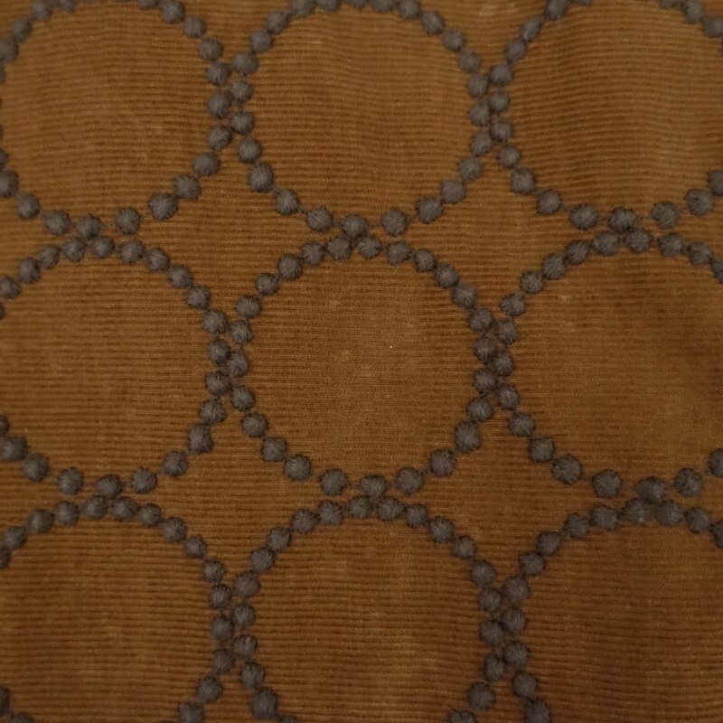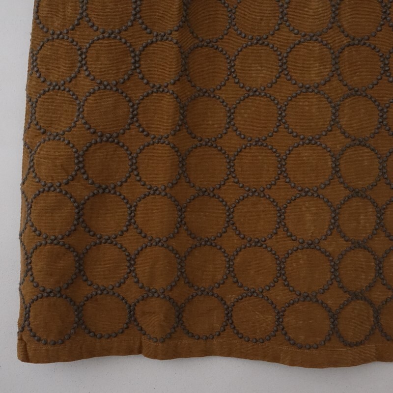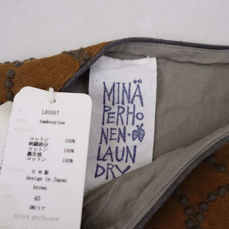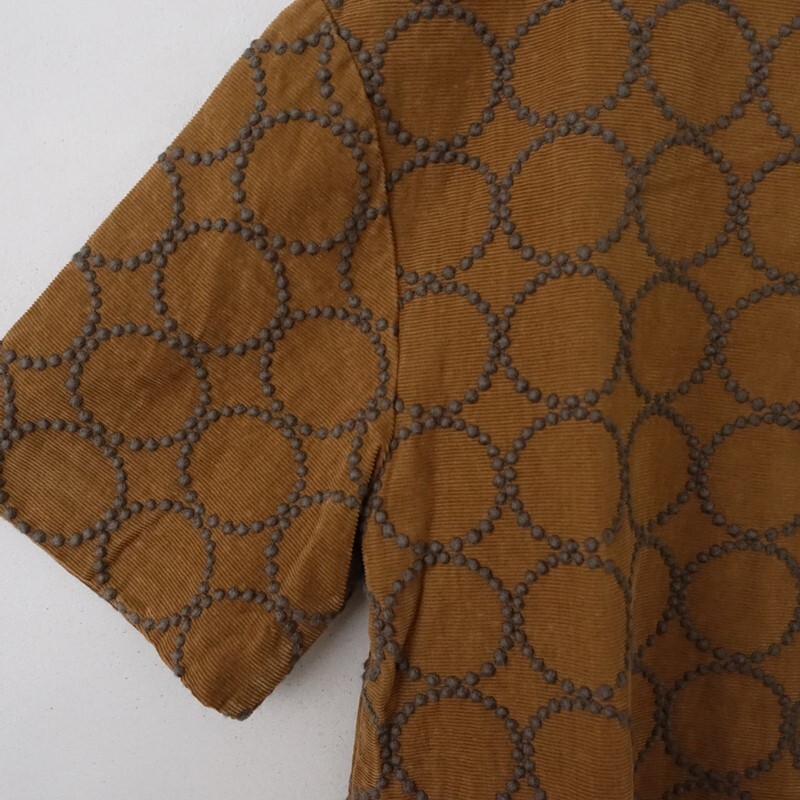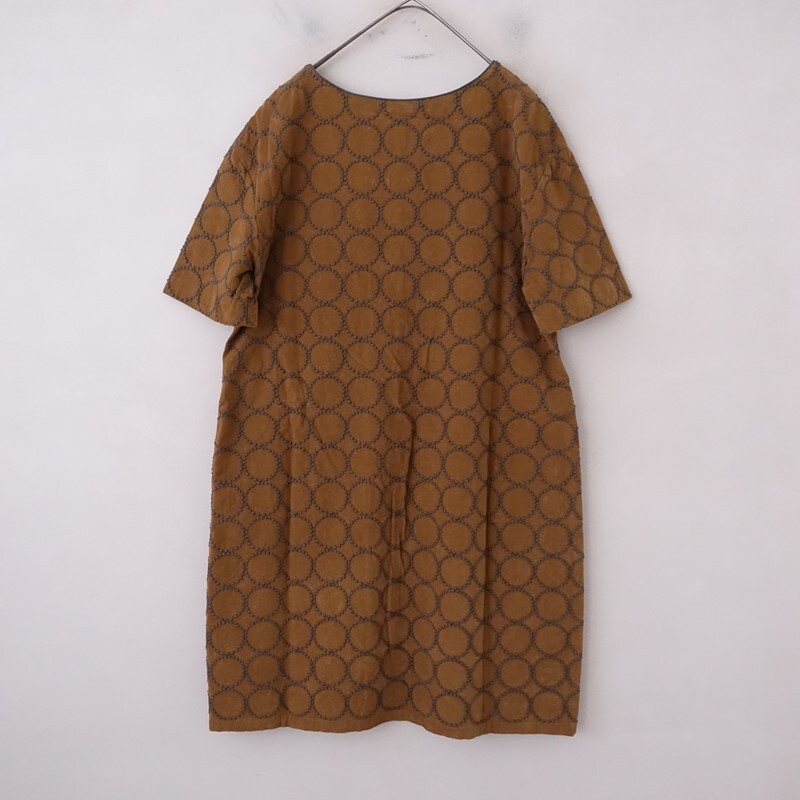 | mina perhonen laundryのtambourine 刺しゅうワンピースです。カラーはブラウンにカーキグレーの刺しゅう入りで、凹凸のあるコーデュロイのようなボーダー織の綿素材です。襟ぐりにコードパイピング付きで、プルオーバータイプで着脱できます。腰両サイドにシームポケットがあり、グレーの裏地付きです。 |