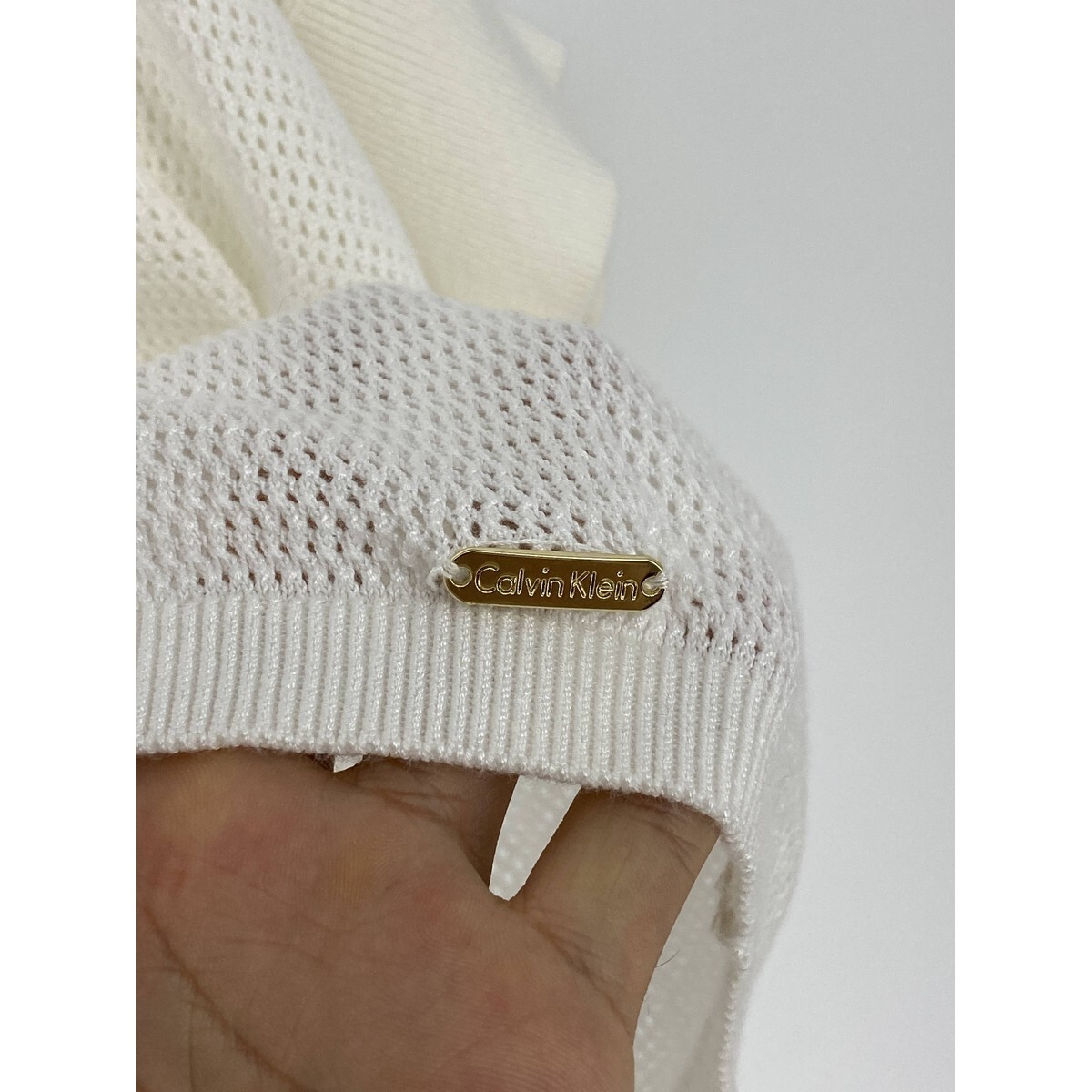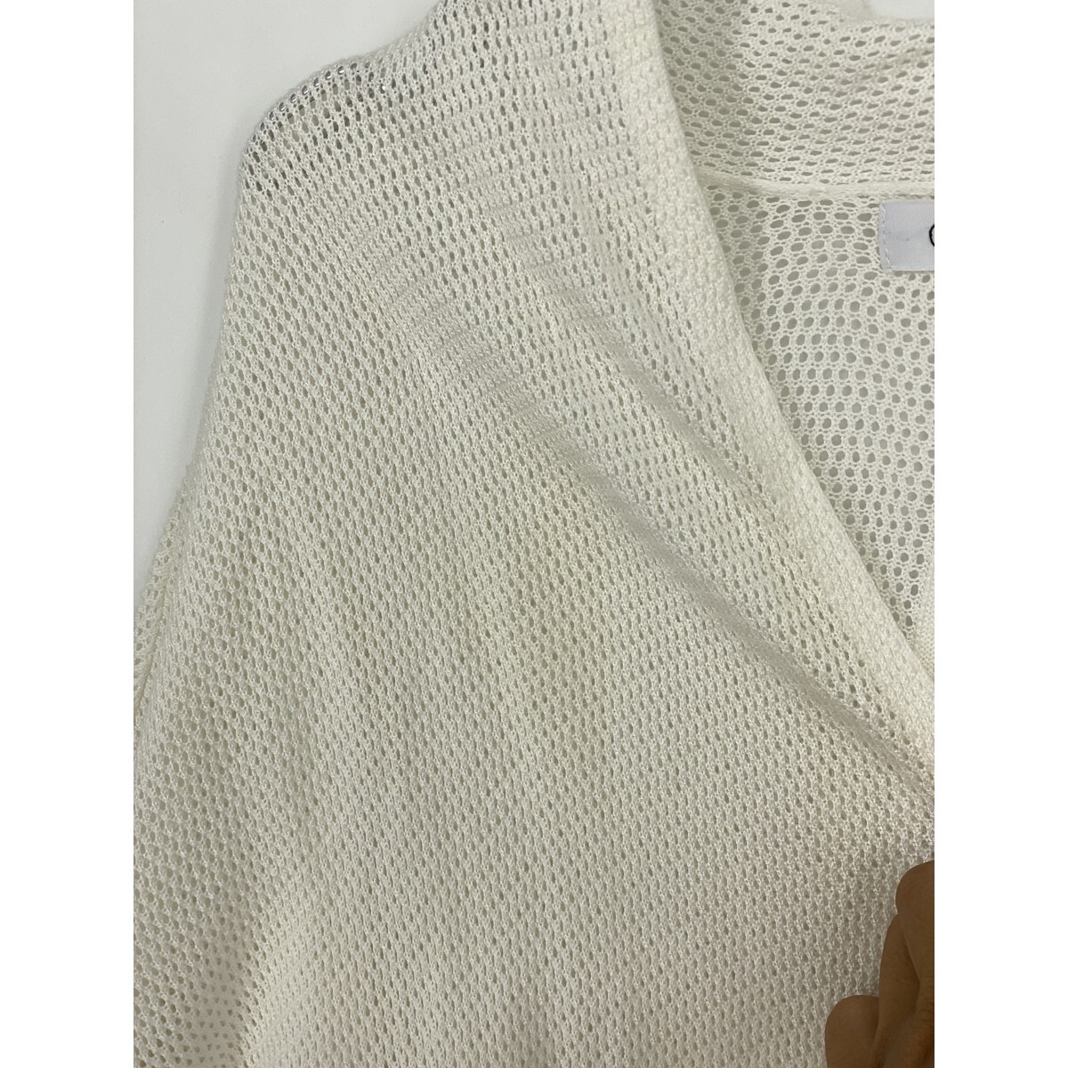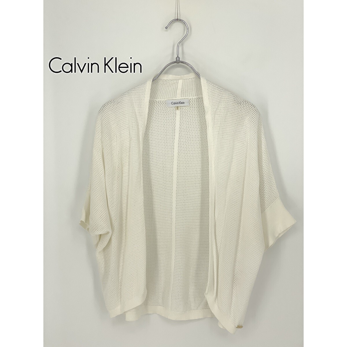 B0645/ Calvin Klein カルバンクライン レーヨン ローゲージ 金装飾 前開き ボタンレス 半袖 ニット リブ カーディガン M 白 レディース