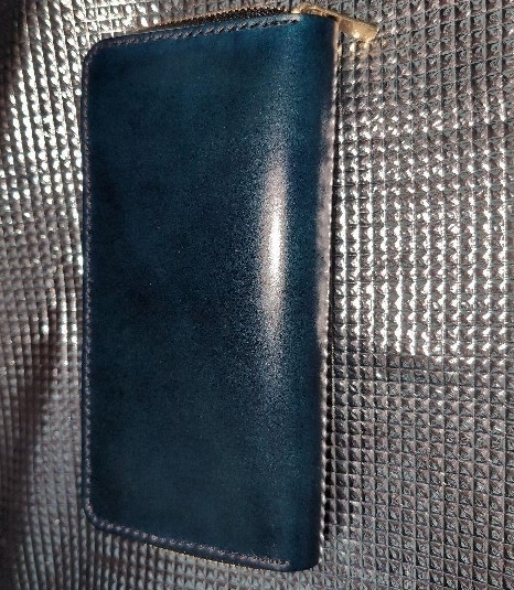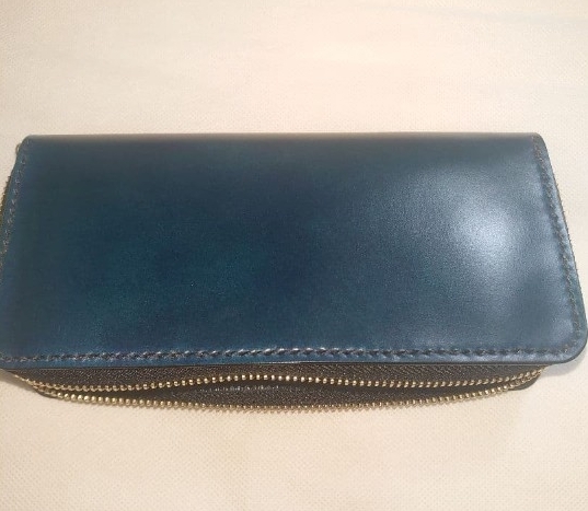 レーデルオガワ社製コードバン(ネイビー)×新喜皮革社製オイル馬ヌメ革(ネイビー) ラウンドファスナー長財布 / 総手縫い。
