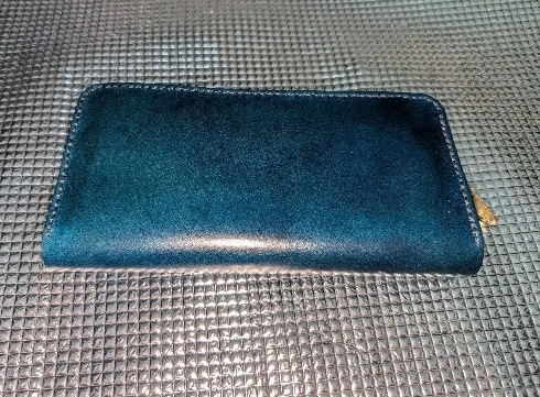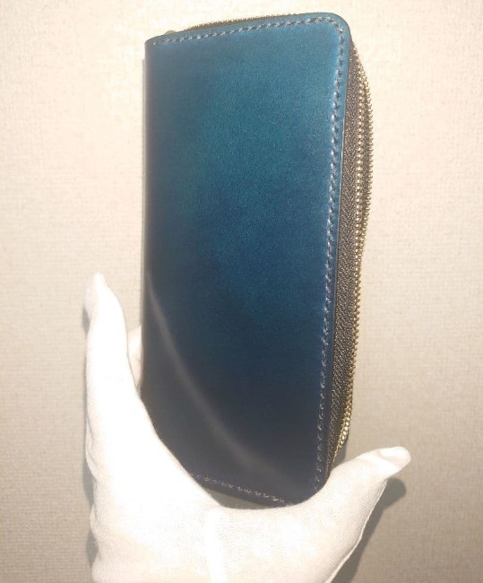 独特の色合いや光沢が特徴のレーデルオガワ社製コードバンを使用し、総手縫いで製作したラウンドファスナー長財布。