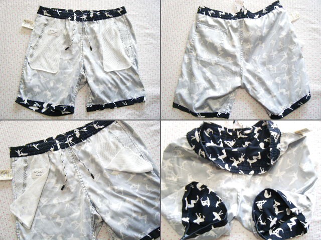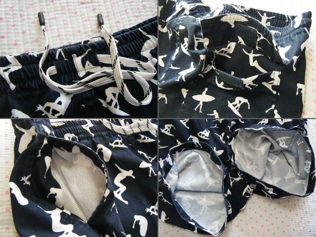 本体は軽量ポリエステル、綿素材。   表面は非常に滑らかな肌さわりよい加工がされた生地で、裏面はツルっとしたサテン調に加工されたカジュアル用ショートパンツ・ボードショーツ・サーフパンツ。   ウエストにドローコード装備。   両サイドにポケットあり、ポケットはメッシュ生地使用。   右ヒップにフラップ付きポケットあり (面ファスナー装備)。   日本製 【MADE IN JAPAN】   カラー ブラック  白抜き総絵柄あり