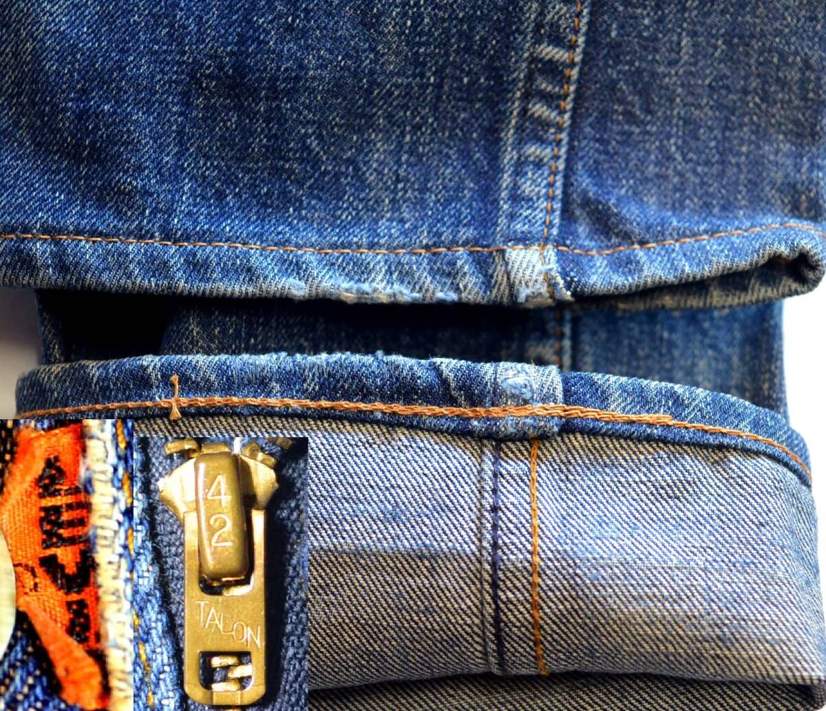 60'sの606ビッグEです。復刻、レプリカではありません。『ディテール紹介』フロントボタン裏の刻印4、タロン42ジッパー、裾チェーンステッチ仕上げ。『状態』 リペア=両モモ・裾、お尻、股。いずれも非常に高度な、ほとんどわからないリペアです。その他=スレ、キズなどUSED感があります。生地はしっかりしています。『色落ち、特徴など』色落ちは抜群にかっこよく、ビッグE特有の非常に深みのあるインディゴで、全体に綺麗な縦落ちが見られます。ヒゲやハチの巣も出ており、メリハリもあり、ベストな風合いです。良い条件の揃った606ビッグEは完全に掘りつくされており、入手は困難を極めます。 少し細めの方にベストなサイズで、希少ではないでしょうか。