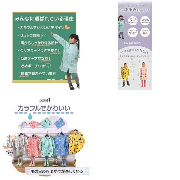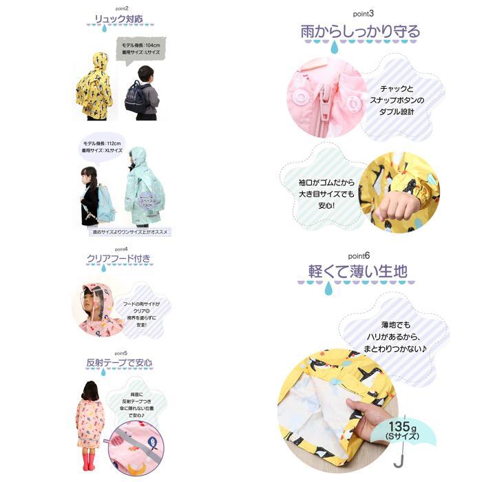 | 商品説明 | ・・雨の日もhappyに!優しい色合いとプリントが可愛い、キッズレインコート♪ ・フードの広い範囲がクリア素材で作られているから、視界をさえぎらない♪ ・背面には反射テープつき。薄暗い雨の日でも、車のライトに反射して光るので安心。 ・後ろ身頃に充分なタックを入れた、ゆったりとした作り。リュックやランドセルを背負ったまま着用できて、とても便利♪ ・袖口は雨の侵入を防ぐゴムテープ入り。多少大き目のサイズを購入しても袖丈の調節が可能♪ ・お子様でも脱ぎ着がしやすい、スナップボタン。 ・お気に入りのカラーを選んで、雨の日も楽しくお出かけ♪ |
