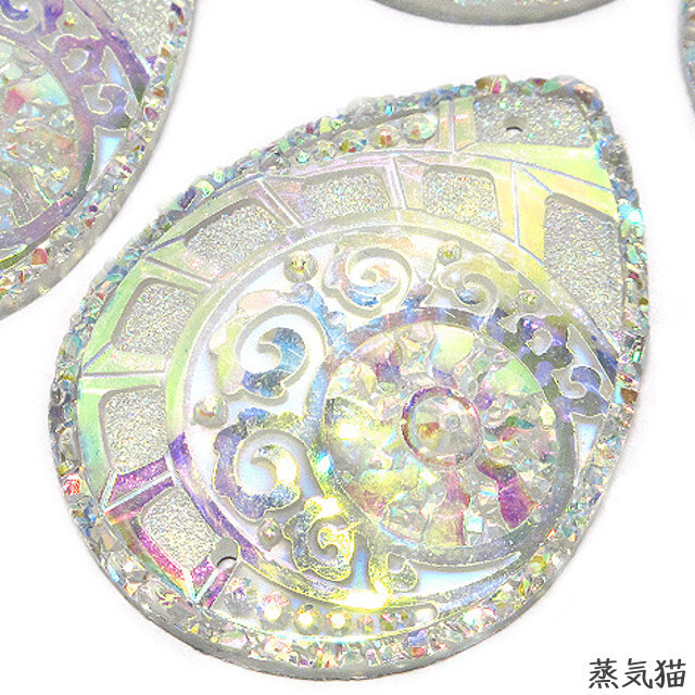 o8730 しずく型ビジュー 不思議柄 39mm x 29mm オーロラ 5個です。光の角度によって色合いが変化して綺麗です。上下に糸通し穴があいているため縫い付けも可能です。ビジュー装飾、ビーズ、チャーム、ピアス、イヤリング、ネックレス、レジン等、様々な作品のアクセサリーパーツ素材として。