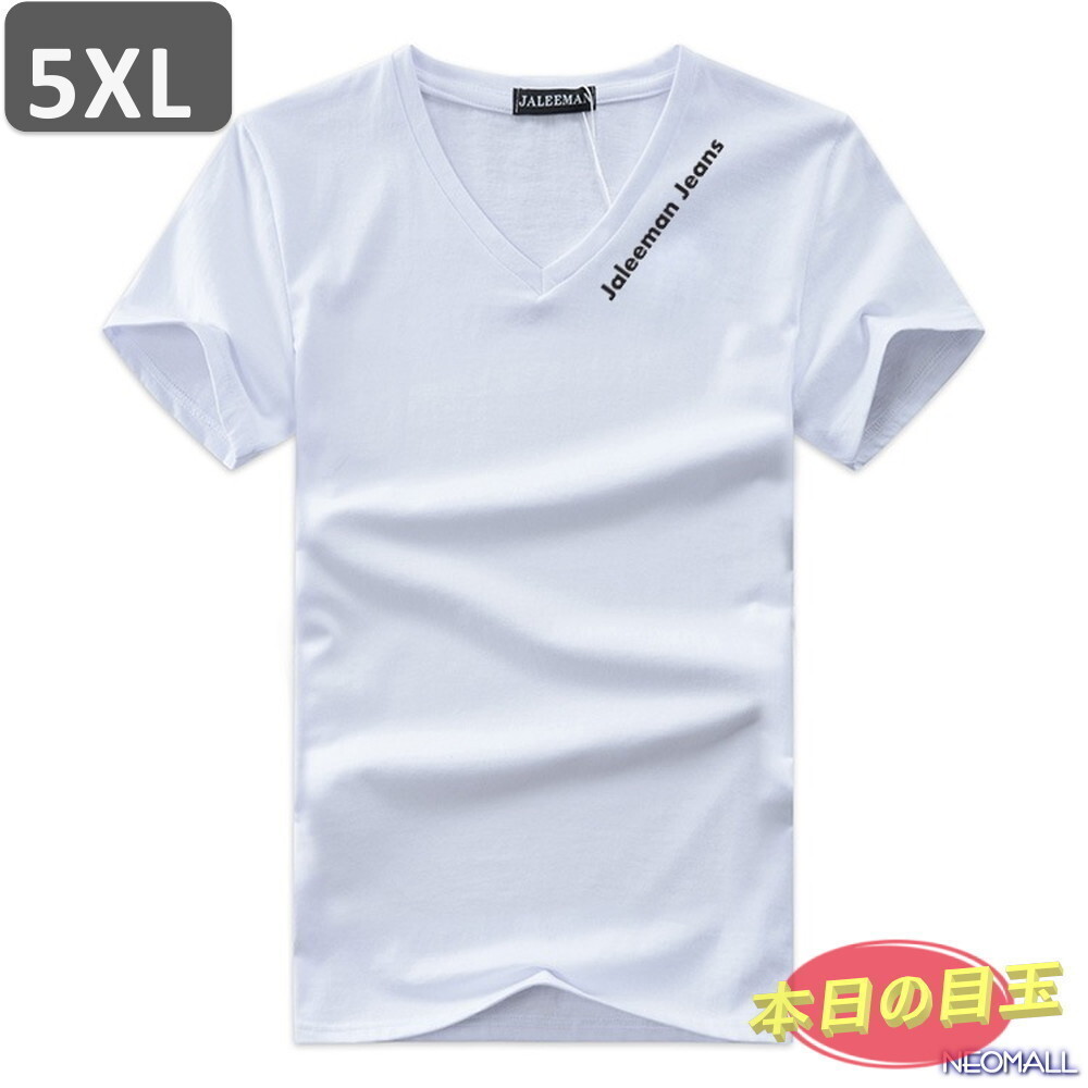 本日のお買得 ☆ Vネック 半袖 Tシャツ【451】 ホワイト 5XLサイズ トップス シャツ シンプル イラスト デザイン 春夏