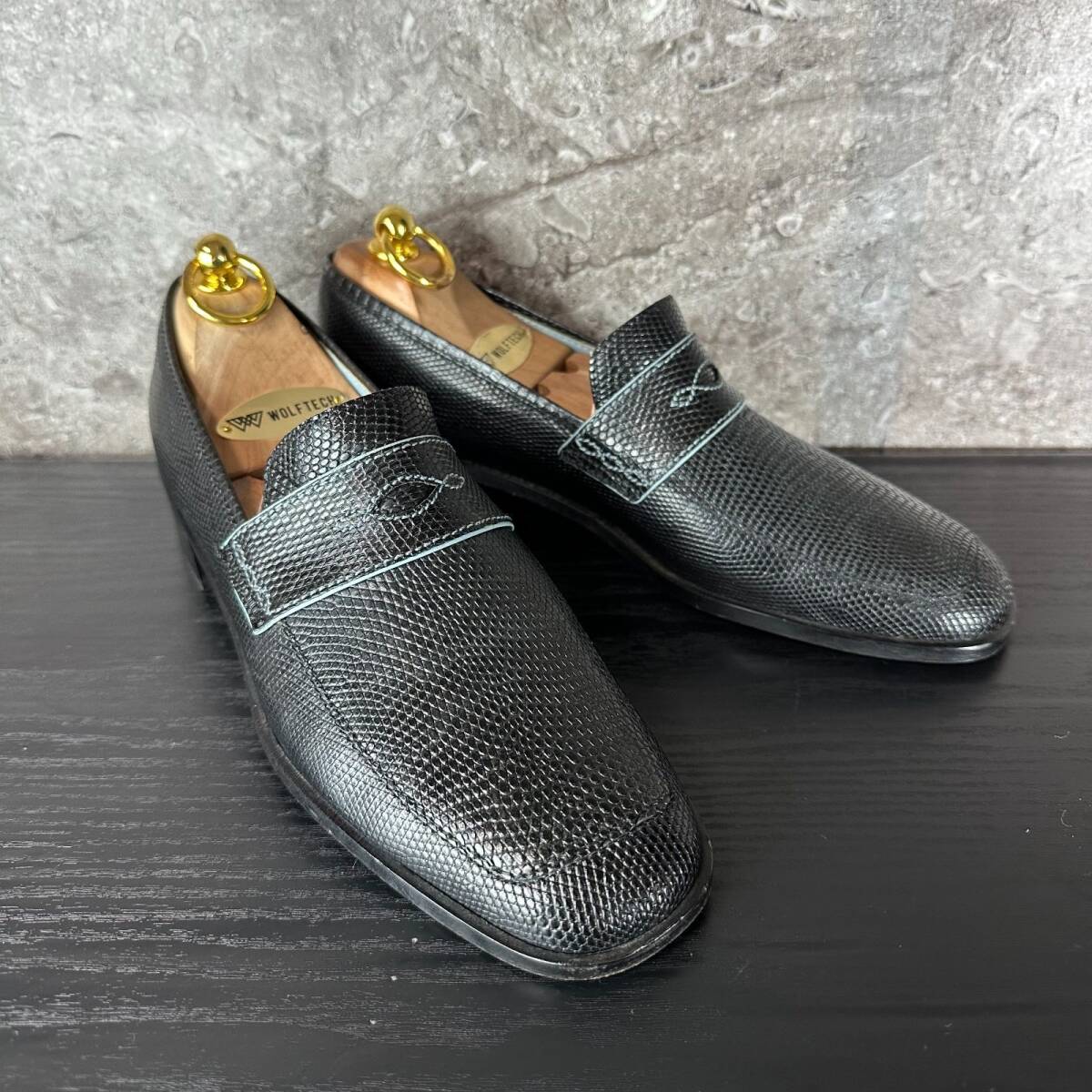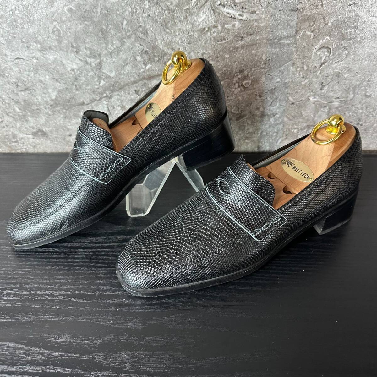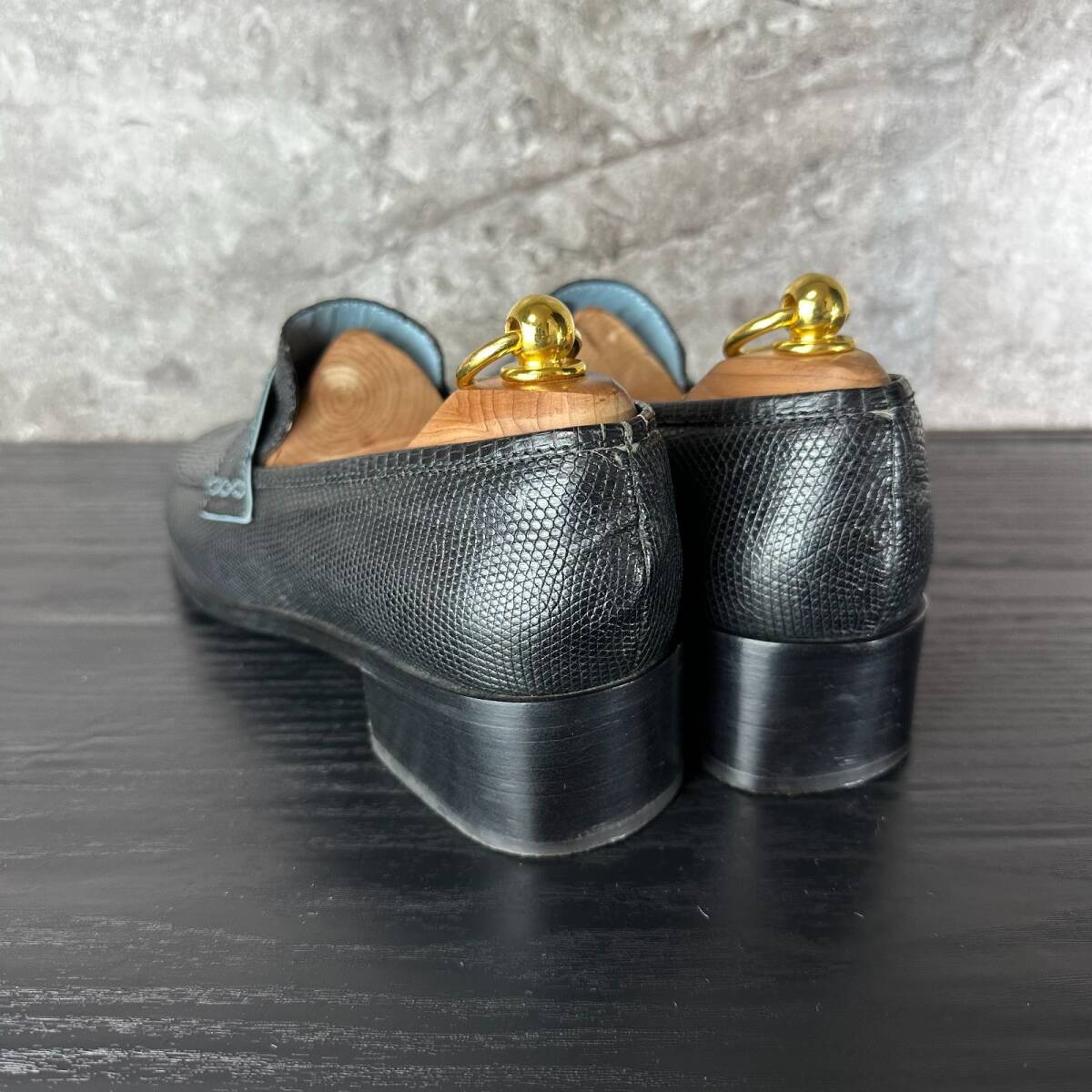 ブラックカラーの重厚な佇まいと、ミニマルなコインローファーデザインが融合し、
