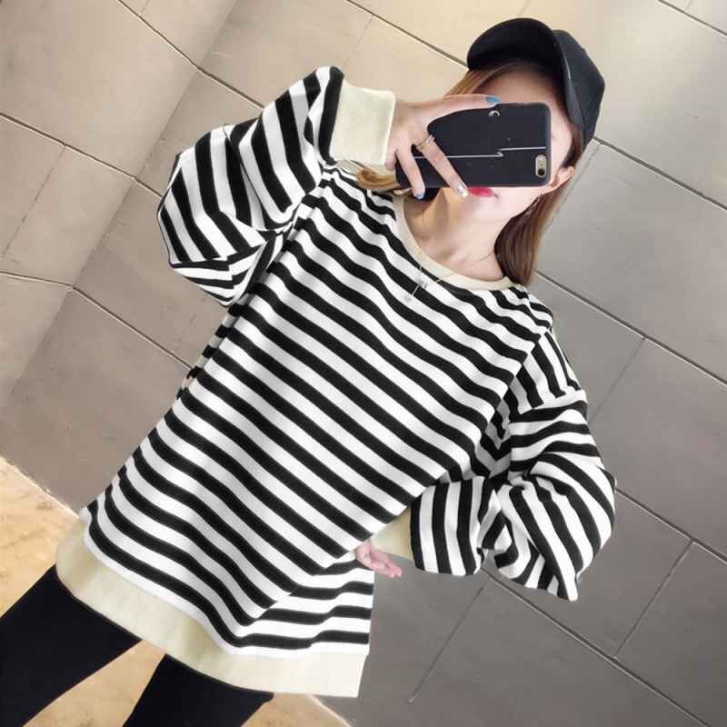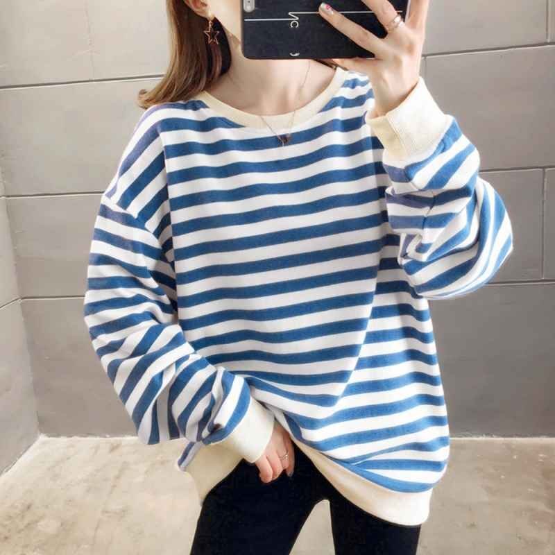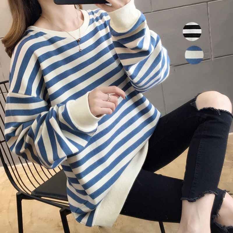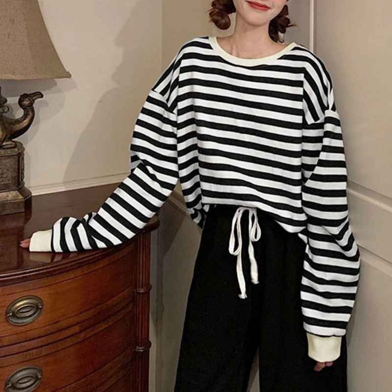 程良くゆったりしたシルエットとヒップラインの隠れる丈感のボーダー柄スウェットです。