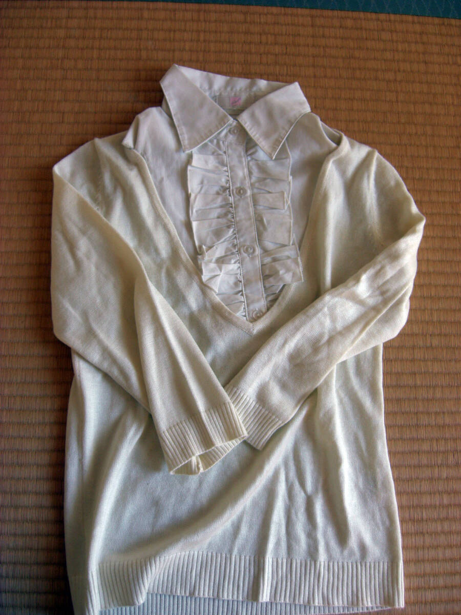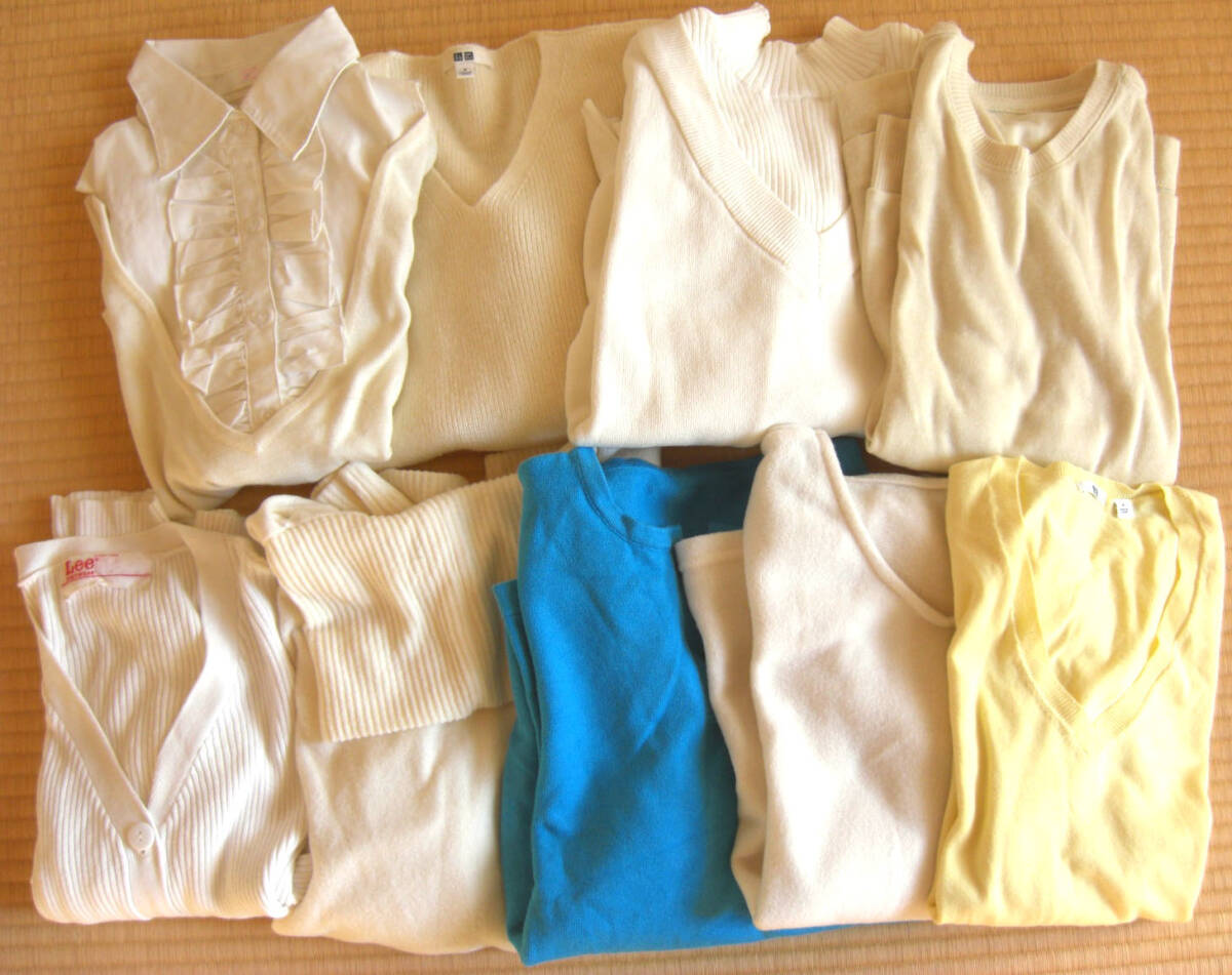 ホワイト、オフホワイトが中心です。サイズはM~Lで、LEEのカーディガン、ユニクロなど9枚。元払い送料が850円ですので、一枚100円を加えて1750円と設定させて頂きました。