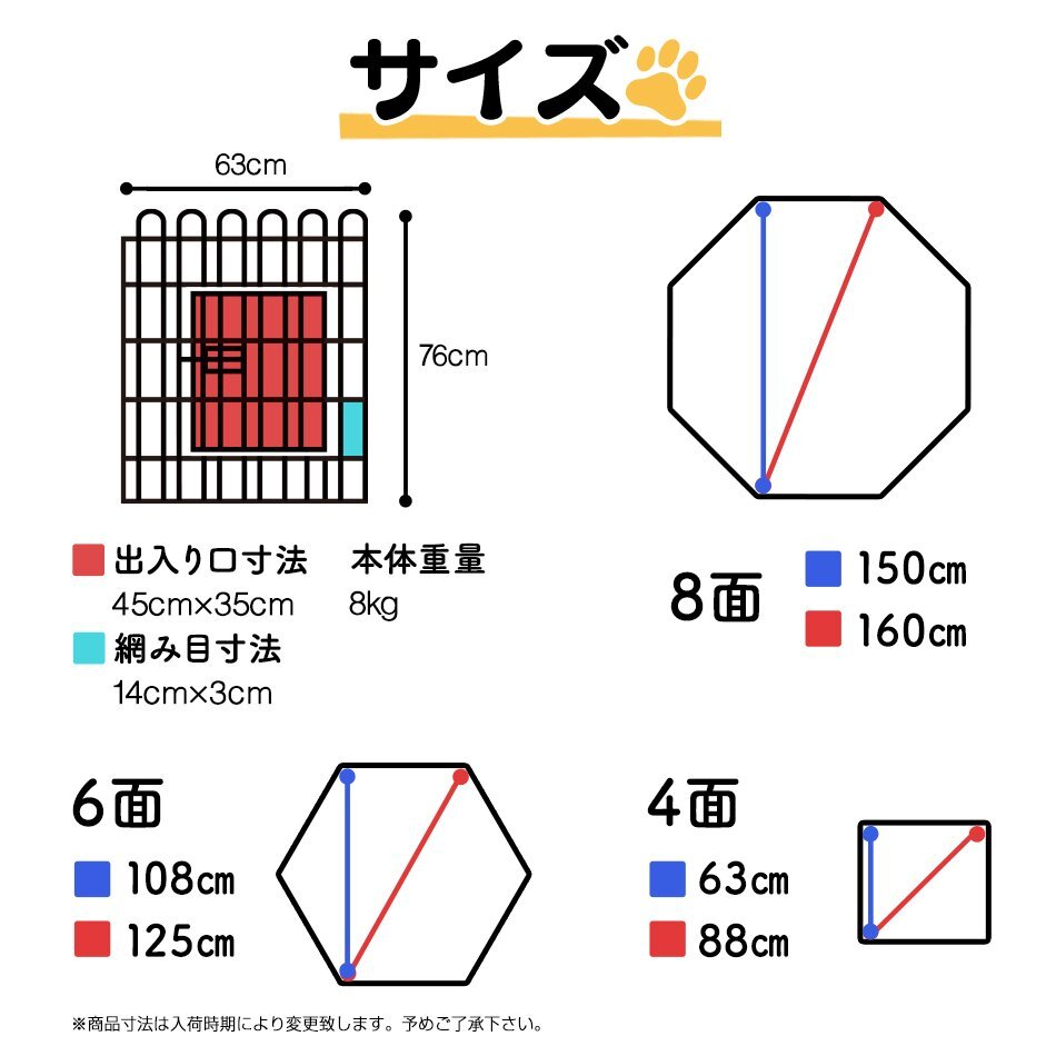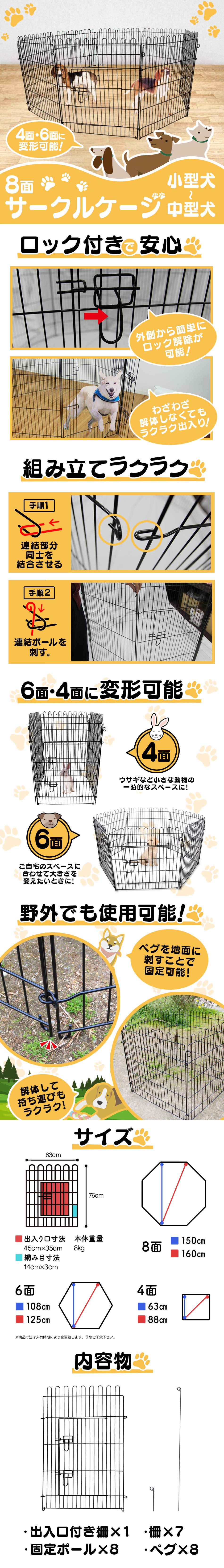 | ワンちゃんにぴったりのサークル! 室内でもアウトドアでもご使用いただけます。 設置場所、用途に合わせ簡単に色んな形に出来ます♪ 組立ては超カンタンです! ウサギなどの小さな動物でも使えます♪ 上部はワンちゃんが怪我をしないように丸く加工しています。 ドア付きで簡単に出入りできます。 もちろん、ロックで脱出防止! 屋外使用時に便利なペグが付属しています。 アウトドアやお庭で大活躍! 【商品仕様】 形状:8面 1面サイズ(約):幅63cm×高さ76cm 入口サイズ(約):幅45cm×高さ35cm 本体重量(約):8kg 材質:スチール 扉の向き:右開き 【商品内容】 ドア付き柵 ×1 柵 ×7 ペグ ×8 固定ポール ×8 【注意事項】 ・ペットに合った高さのサークルをお選びください。 ・室内でのご使用時には床に傷がつかないよう保護してお使いください。 ・商品は、モニターによって色合いが異なって見える場合があります。 ・仕様・デザインは改良のため予告なく変更することがあります。 |