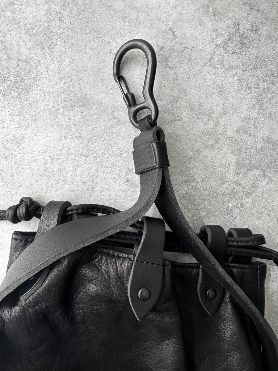 巾着仕様の本体に加え、上部には金属製カラビナが付属しており、ベルトループやバッグに直接取り付けて使用できる機能的なデザイン。スタイリングのアクセントとしても優秀で、ヨウジのレザー小物らしい独特の存在感を放ちます。