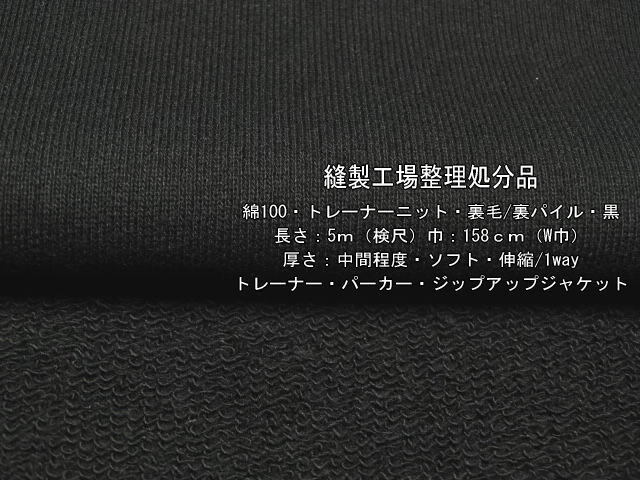 | 綿100 トレーナーニット 裏毛/裏パイル 中間 ソフト 黒 5m W巾 | |