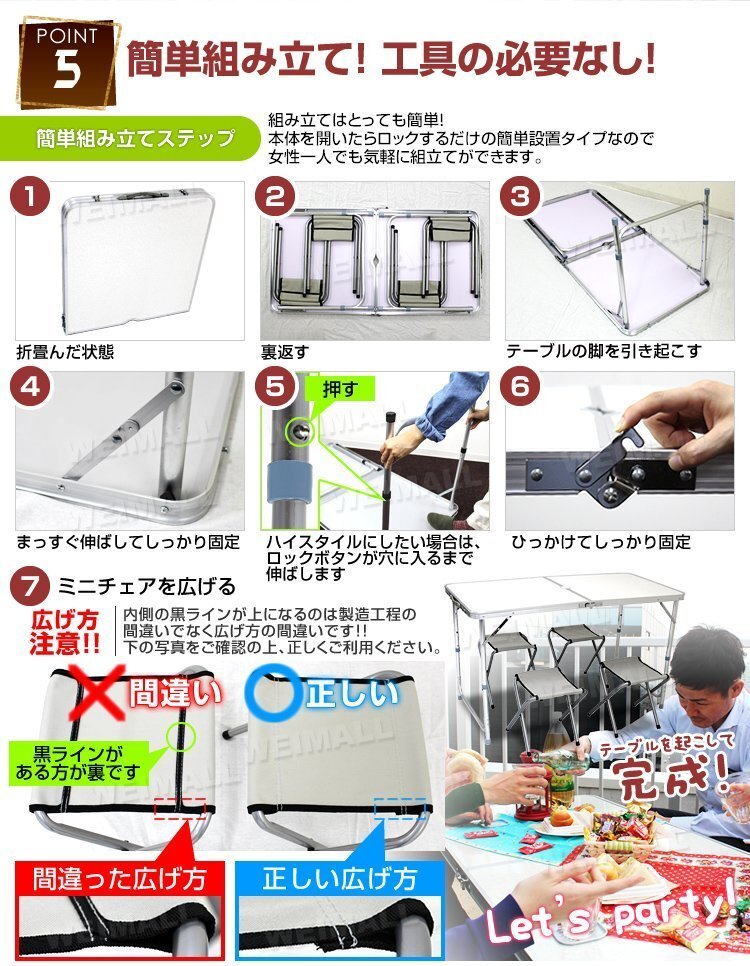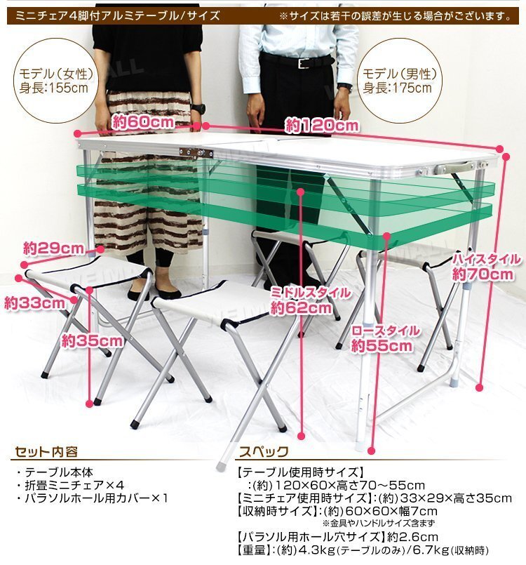 | 軽量アルミ製+取っ手付きで持ち運びしやすい! 椅子はテーブルの中に収納し折りたためるので、車のトランクに積んで移動もラクラクです。 開いてロックするだけの簡単設置タイプなので、女性でも1人で組立カンタン! テーブルは3段階の高さ調節ができ、ローテーブルとしても使えます。 天板中心部にはパラソル用ホールがあるので、ベランダやテラスでの使用にもおススメです♪ ■商品コード:A61120B ■商品仕様 カラー:ブラウン サイズ(約) テーブルサイズ:幅120×奥行60×高さ55/70cm 収納サイズ:幅60×奥行7×高さ60cm チェアサイズ:幅33×奥行29×高さ35cm パラソル用ホール直径サイズ:26mm 重量:(約)4.3kg ※テーブルのみ 耐荷重:(約)テーブル25kg / イス70kg 材質:(天板)MDFボート(耐熱・防水加工) (外枠)アルミニウム、スチール、ポリプロピレン 他 ■注意事項 ・初めてご使用の場合、耐久性を高めるために天板がフラットにならず山なりになっております。 適度な力で上から押していただくと改善されますので、お試しください。初期不良ではございません。 ・海外製品で、簡易梱包での輸入のため風防に擦れや多少の小キズなどがある場合がございますが、 商品自体には問題ありませんのでご了承下さい。 ・商品は、モニターによって色合いが異なって見える場合があります。 ・仕様・デザインは改良のため予告なく変更することがあります。 ■保障期間 7日間 ※商品到着後7日以内の初期不良・破損のみご対応させていただきます。 【新品未使用品です】 |