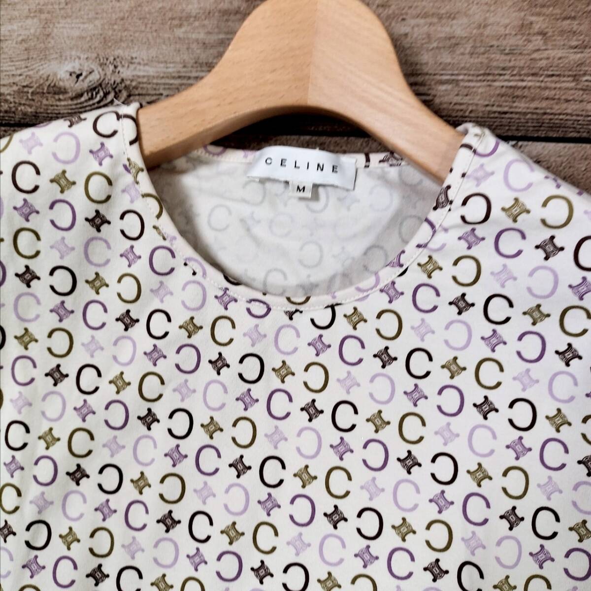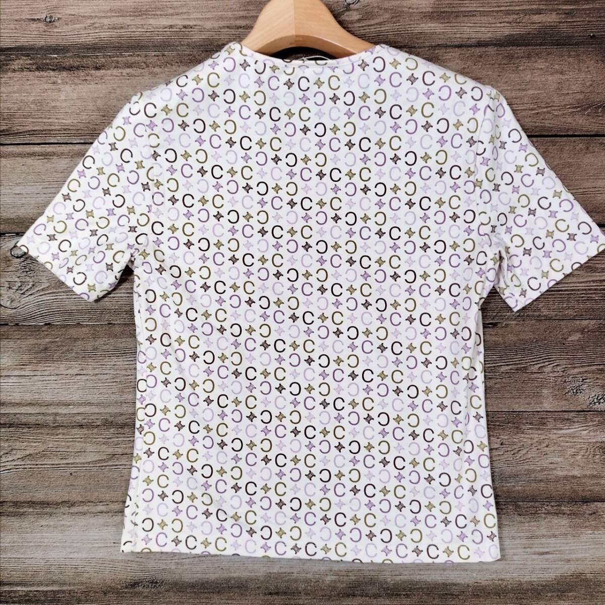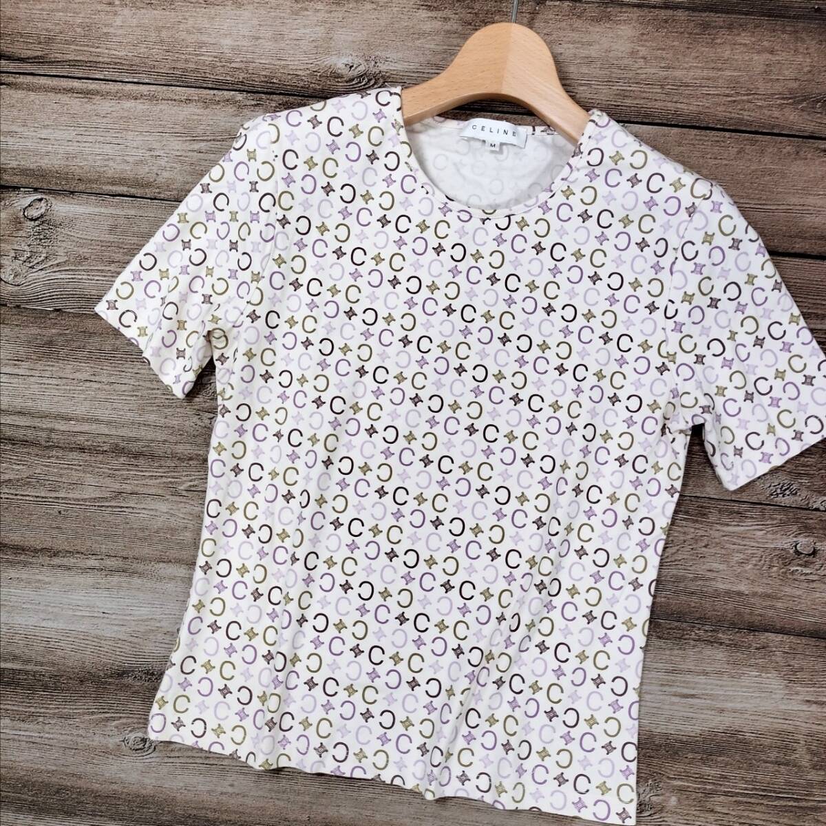美品 CELINE セリーヌ レディース 半袖 Tシャツ トリオンフ総柄 マルチカラー ホワイト ベージュ パープル コットン100% Mサイズ 高級感