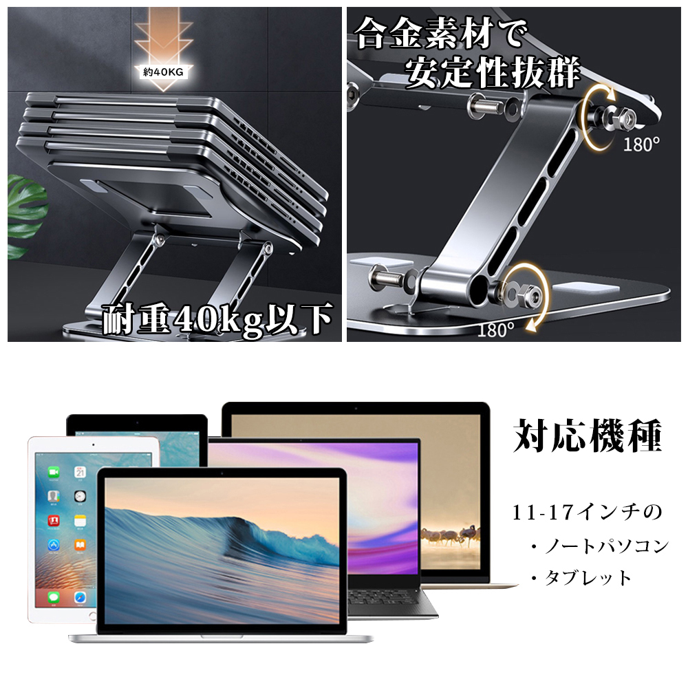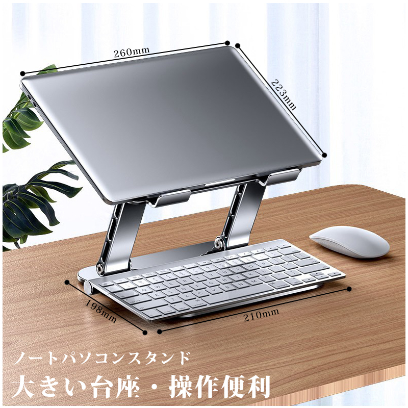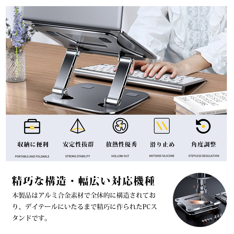 ノートパソコンスタンド本体は角度調整が硬めに設計されており、調整器具も付属しているため、使用中に下がってくることはなく頑丈で、両足構造なので安定感も抜群です。 また、パソコンがあたる部分やスタンド接地側にシリコーン製の滑り止めパッドが付いているため、パソコンに傷を付ける事を防ぎ、滑ることがなく安定して使用できます。