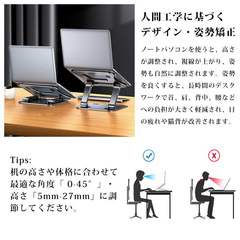 人間工学に基づいた設計により角度・高さが調整可能な仕様で、PC作業時あなたに1番適合な角度・高さが調整でき、視線が上がることにより、姿勢も自然に調整されます。 姿勢がよくなることで、長時間のデスクワークでの首、肩、背中、腰などへの負担が大きく軽減され、目の疲れ、肩こり、猫背が改善されます。