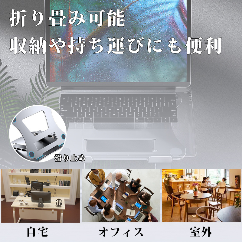 また折りたたみ式スタンドなのでコンパクトに収納ができ、重量も700gで軽量設計されている為持ち運びが便利で、在宅勤務など自宅はもちろん、オフィスや外出先でも利用できます。また、旅行や出張先にも適用です。