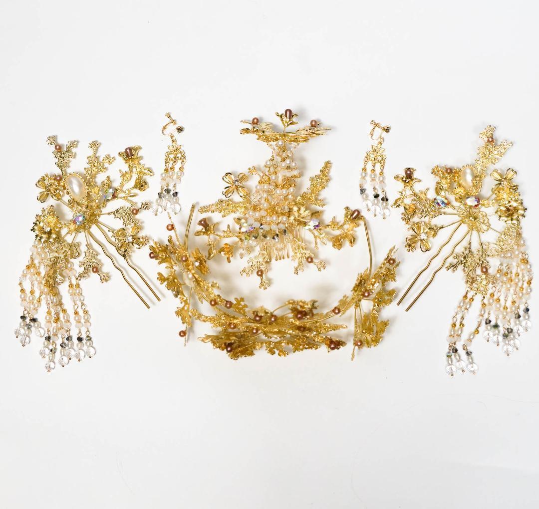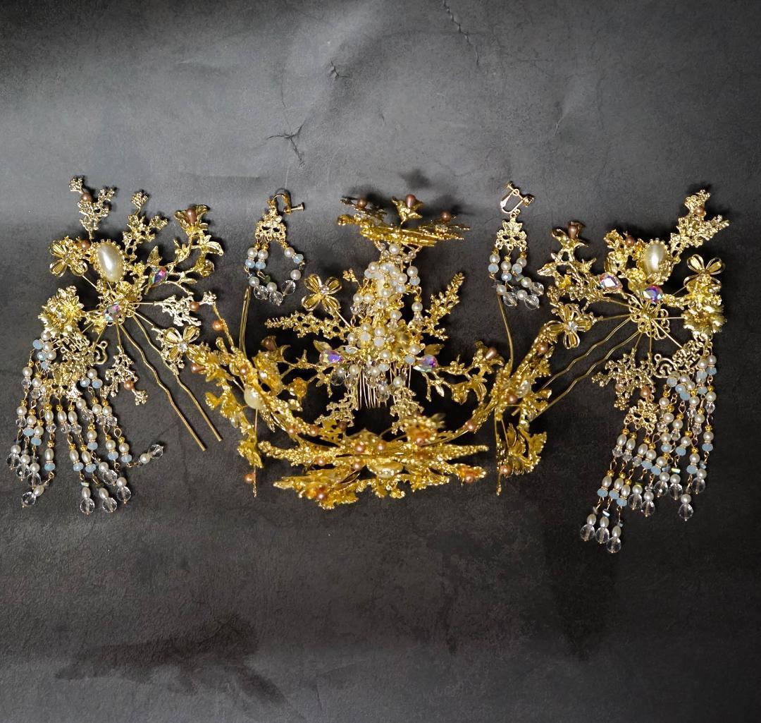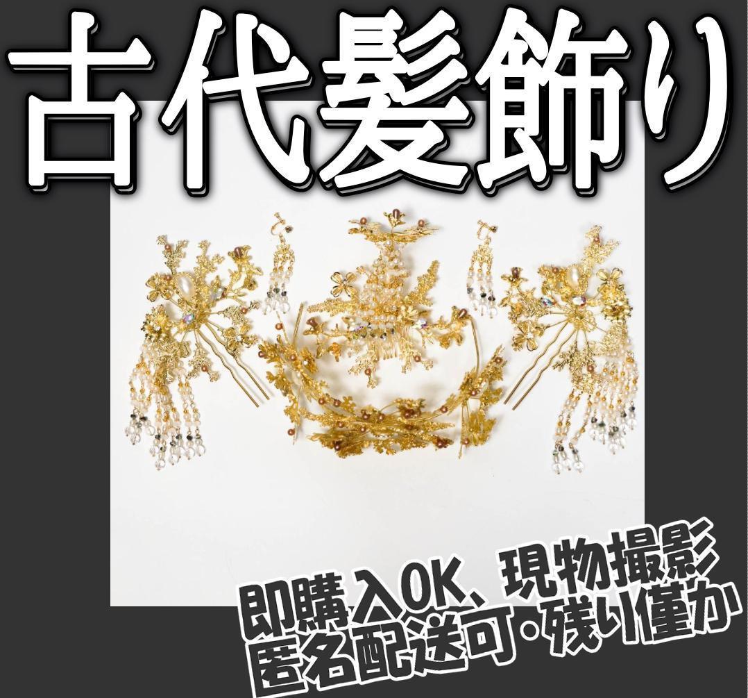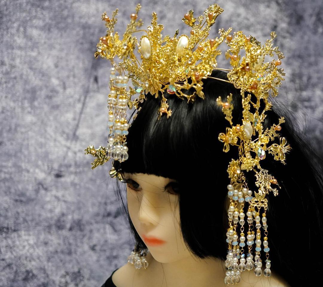 【古代髪飾り】パールと金色のゴージャスで綺麗な細かい花模様の細工を施した、髪飾りとピアス(イヤリング)のヘッドドレスセットです。アジア系の舞台衣装やチャイナドレスなどのコスプレ衣装を着用する時の飾りとして使えば、優雅でエキゾチックな雰囲気を演出してくれます。