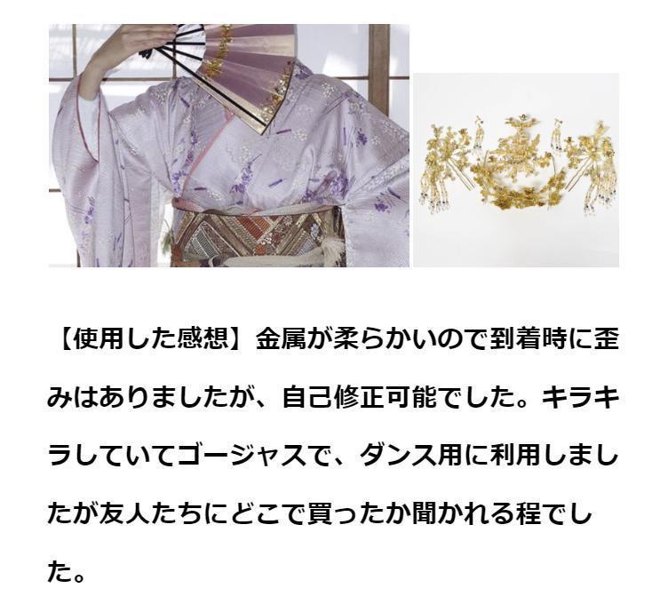 【使用した感想】金属が柔らかいので到着時に歪みはありましたが、自己修正可能でした。キラキラしていてゴージャスで、ダンス用に利用しましたが友人たちにどこで買ったか聞かれる程でした。鮮やかにセットアップでき着物がとても映え、盛り盛りにできます。何かお呼ばれした際にも活用できそうです