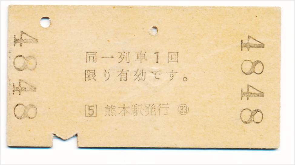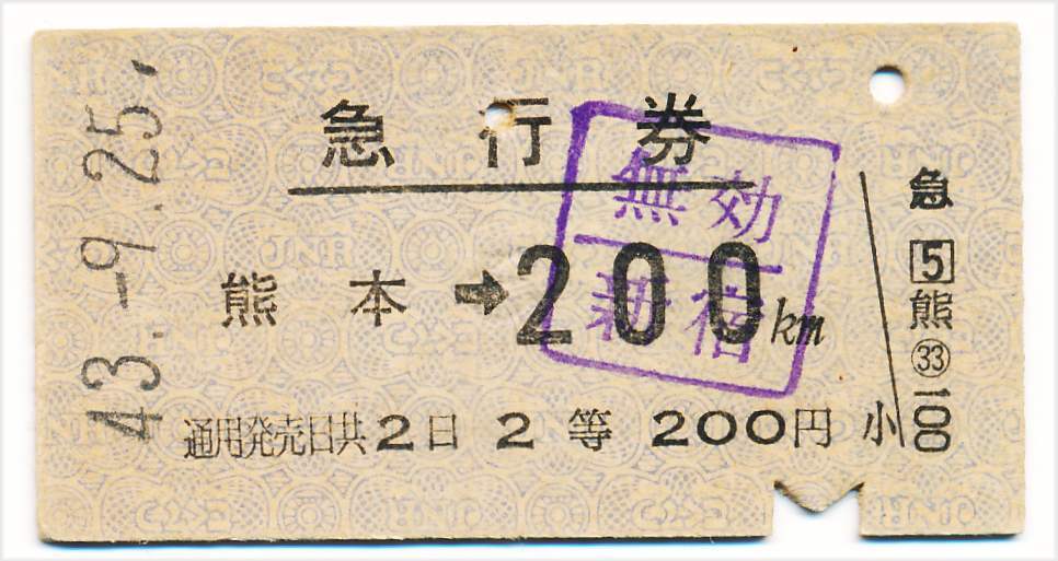 国鉄鹿児島本線 熊本駅発行 急行券 熊本→200km 2等 です。