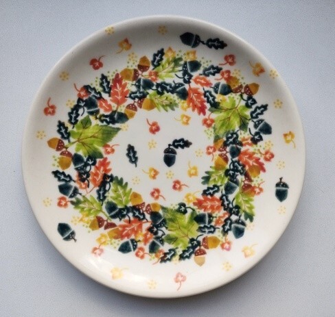 ポーランド ボレスワヴィエツ陶器 木の葉&どんぐりUNIKAT柄 17cmプレート/皿です。