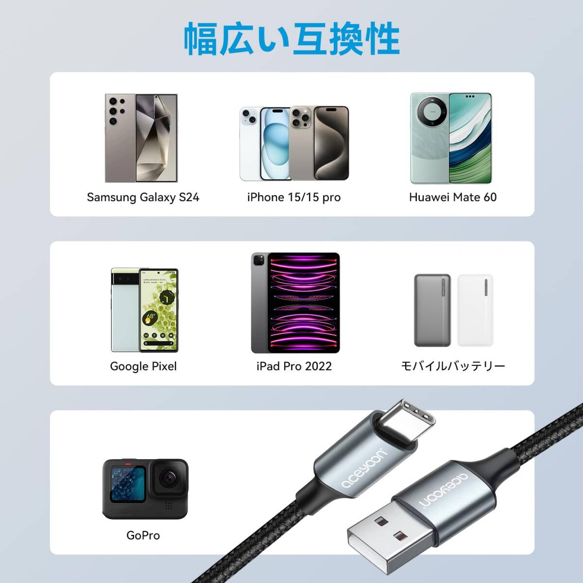 【幅広い互換性】多くのUSB Type-C機器に対応しているので、スマートフォン、タブレット、パソコンに心配なくお使いいただきます。