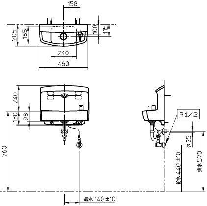 陶器製手洗器 ハンドル式単水栓 取付金具・給排水金具一式付属