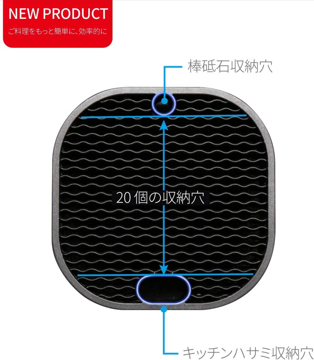 大型の一般的な包丁スタンドより大きく、横幅が14cmもあります。限定された穴ではなく、サイズと関係なく、家庭で使う包丁や果物ナイフ、ステーキナイフ等を15丁まで収納することができます。また、専用のキッチンハサミ収納穴と棒砥石収納穴も備えています。