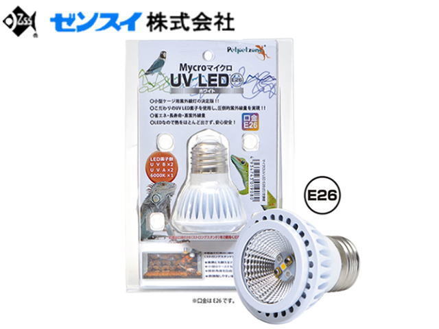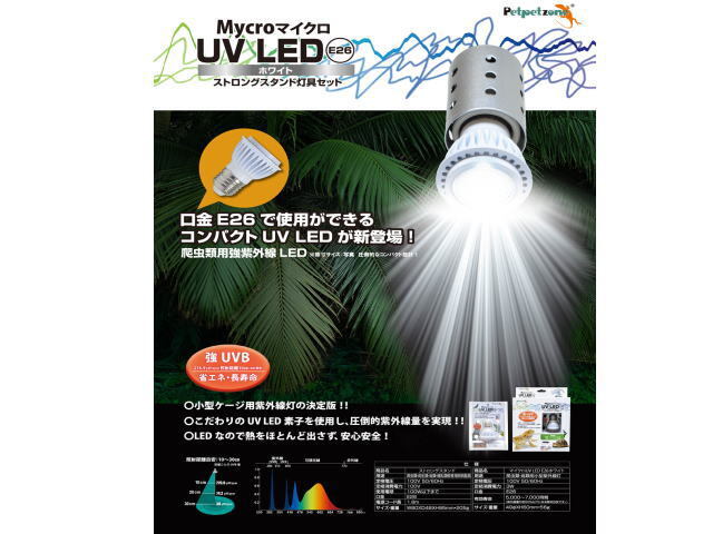 | 商品名:マイクロUV LED E26ホワイト 交換球 省エネ・長寿命小型紫外線LEDライト 小型ケージにイチオシ!UVA・UVBを強力照射! 圧倒的な小ささで小型ケージでもすっきりレイアウト。 13W UV蛍光灯に比べ約4倍の紫外線光量。 5,000~7,000時間と長寿命 照射角度100度でワイドに紫外線を照射。 発熱をほとんどしないので、鳥類への使用もお勧めです。 ■推薦生体 地表・樹上性トカゲ、リクガメ、ミズガメ、ヒルヤモリなど インコ、オーム、猛禽類など ■UVB量目安 照射距離10cm:276.9uW/qcm 照射距離20cm:74.2uW/qcm 照射距離30cm:38uW/qcm ■仕様 商品名:マイクロUV LED E26ホワイト 用途:爬虫類・鳥類用小型紫外線灯 照射目安:10cm~30cm 定格電圧:100V 50/60Hz 定格消費電力:3W 口金:E26 有効寿命:5,000~7,000時間 (※紫外線量が約50%以下になる寿命目安) サイズ重量:49ΦxH60mm、56g ※交換球のみのお届けです。 画像の灯具、ケージ、生体は含まれておりません。 |
