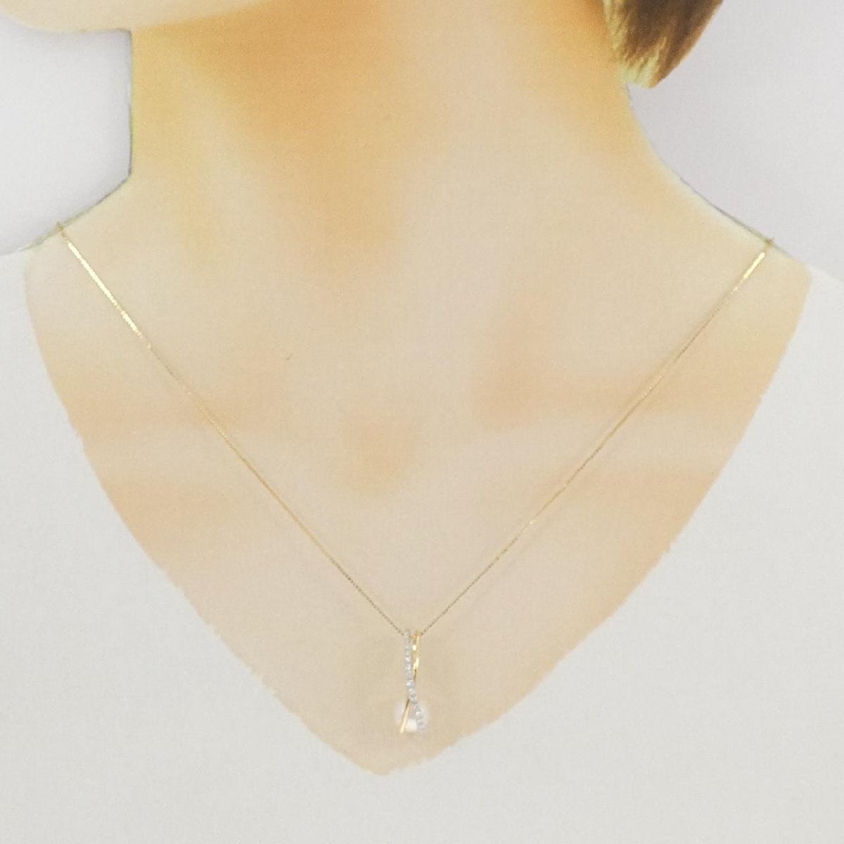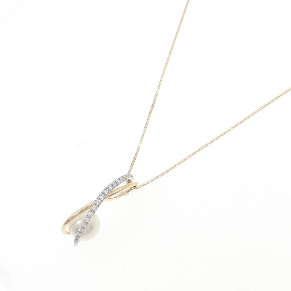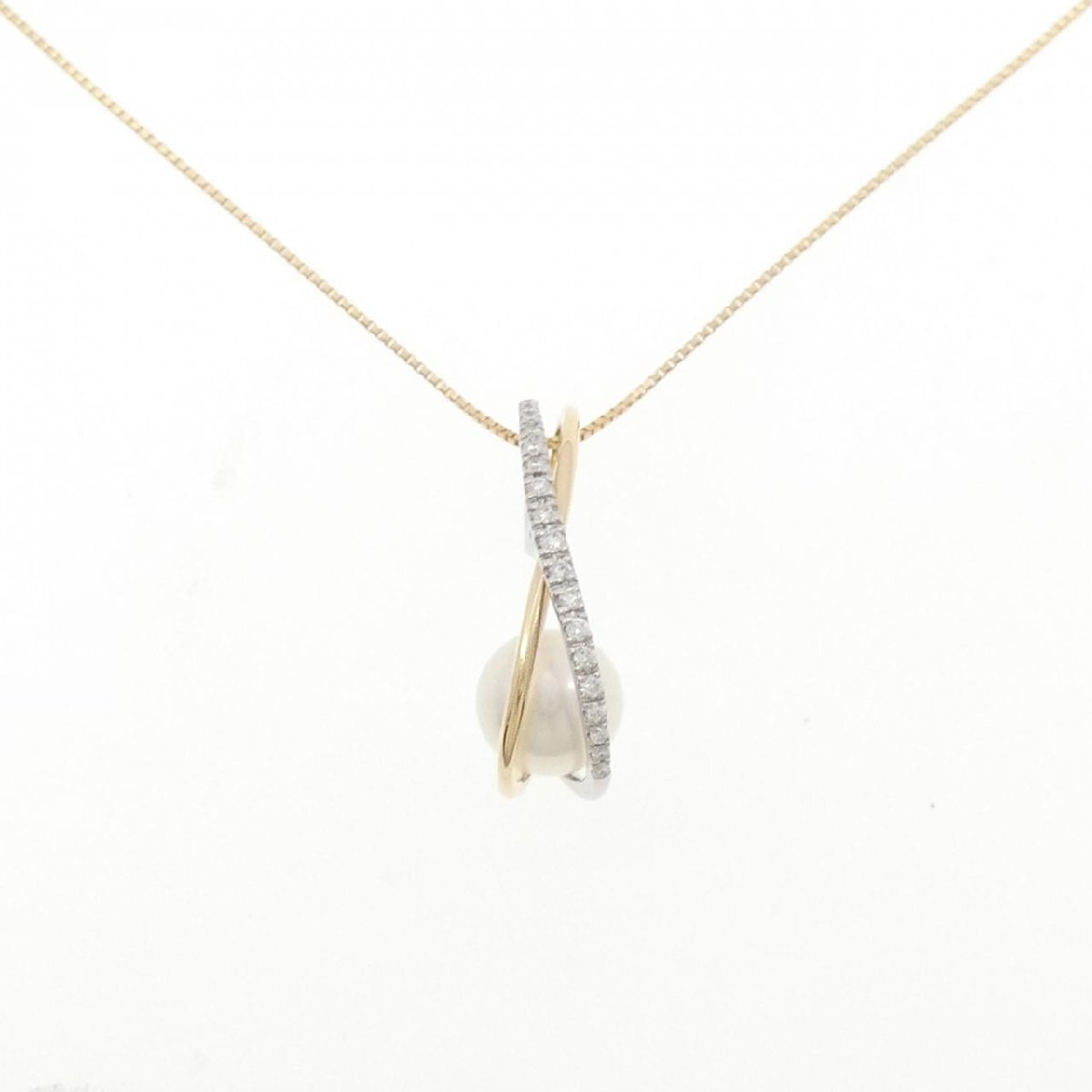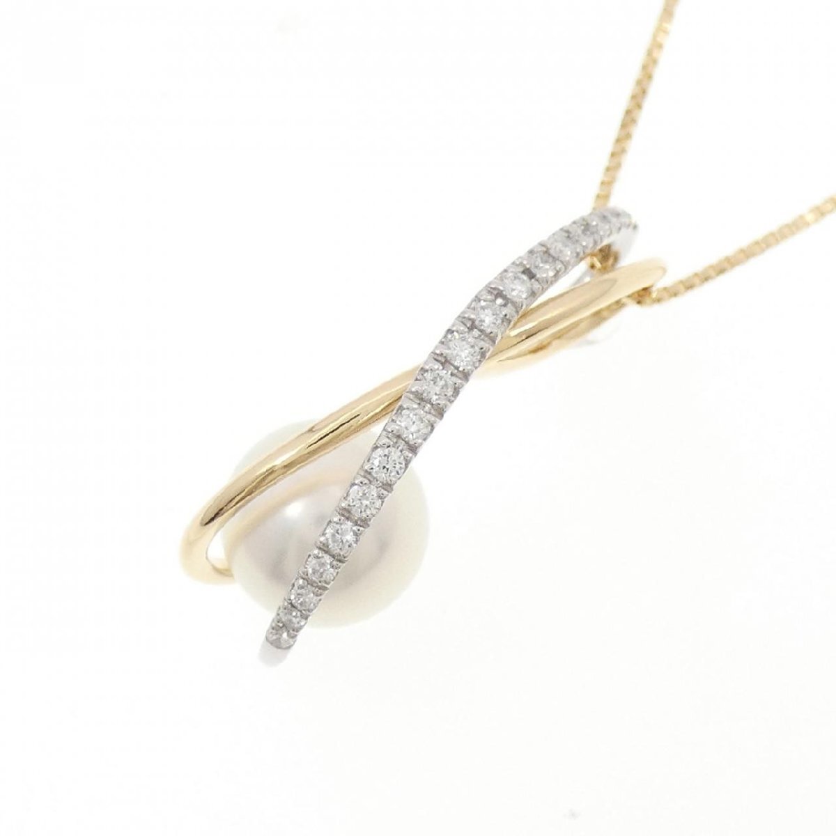 柔らかな光沢のアコヤパールを、流れるような2色のラインで包み込んだデザイン。片側に配されたダイヤモンドの煌めきが、胸元に上品な輝きと立体感を添えます。