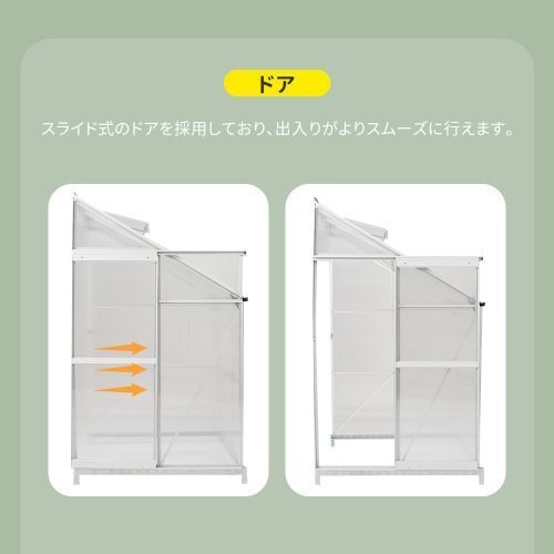 ◆04通気性がいい構造大きなドアと上部の窓で通気性を確保し、空気がスムーズに流通させます。植物に快適な環境を提供します。窓開閉式の窓は5段階に調節可能で、さまざまな通風ニーズに対応します。ストッパーが付いているの簡単に調整できます。ドアスライド式のドアを採用しており、出入りがよりスムーズに行えます。