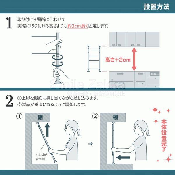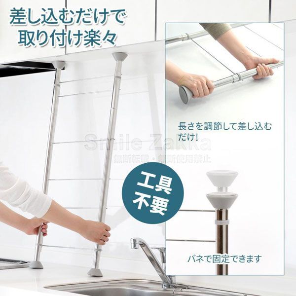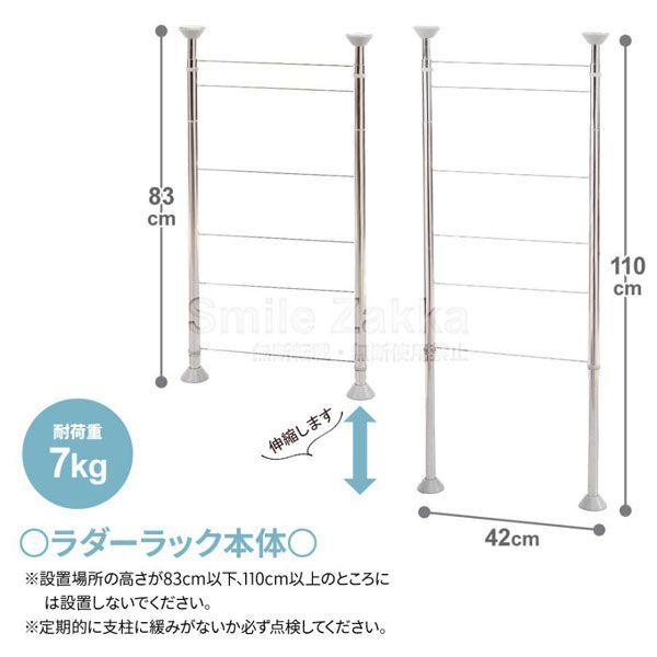 | 内 容 | ■アーネスト MELIS ラダーラック 本体 梯子型 ■サイズ (約)幅42×奥行6×高さ83〜110cm ■耐荷重 (約)7kg ■重量 (約)1140g ■材質 ステンレス鋼、ポリプロピレン、TPE ■付属品 取扱説明書 ◆参考価格 8250円 ・長さを調節して差し込むだけ! ・組み立て簡単な、ハシゴ型の突っ張りラックです。 ・キッチンの吊戸棚の下などに設置でき、 狭いキッチンのスペースを有効活用できます。 ・工具不要で女性でも簡単に取り付けられます。 ・別売りの皿立てや調味料ラックなどのパーツを組み合わせれば、 ご家庭に合わせた便利な収納ができます。 ・ハシゴ型なので、パーツを吊り下げるだけで簡単にセットできます。 ※こちらの商品は【ラダーラック本体】のみです。 ※設置場所の高さが83cm以下、110cm以上のところには設置しないでください。 |