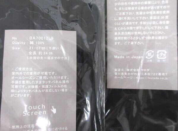 | 内 容 | ■レディース クロダ 抗菌抗ウイルス 消臭・帯電防止 グローブ(BA70012L9) ■サイズ:手囲い21-22cm 全長約24cm ■素材:綿100% ■カラー:ブラック ■日本製 ハイブリッド触媒TioTioPREMIUMの加工技術を施し、 抗菌抗ウイルス、消臭・帯電防止効果を持ち合わせた手袋。 素材には、肌触りの良いコットン100%を使用。 紫外線カットの機能もあり、オールシーズン、 外出時や室内でもご使用いただけます。 また、手袋を着用したままのタッチパネル操作も可能です。 洗濯にも強く、繰り返し洗濯しても効果が長期間持続します。 公衆衛生に気を配りたい今だからこそ重宝する心強いアイテム。 ◆総額 38500円相当 ※タッチパネル反応しにくい場合があります |