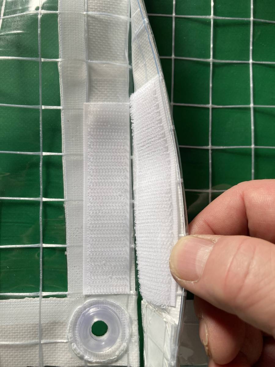 上部穴(ハトメ)約30㎝ピッチ、四方3㎝折り返し。オプションでS字フックお付け出来ます。
