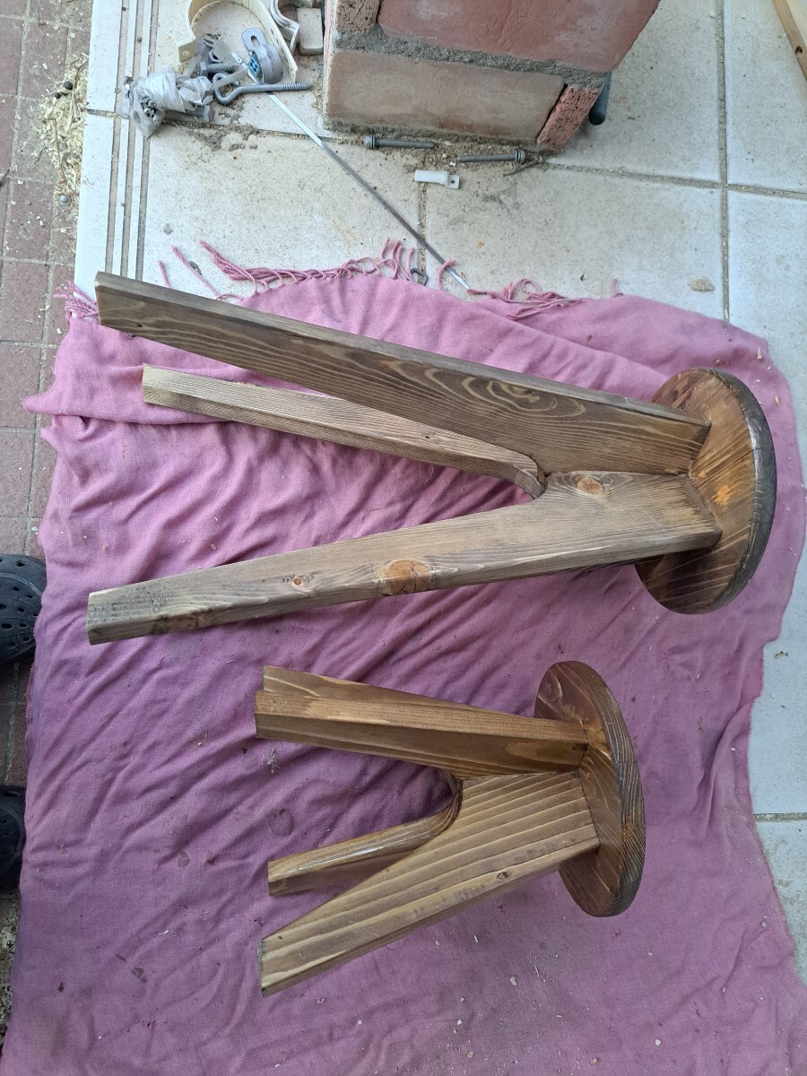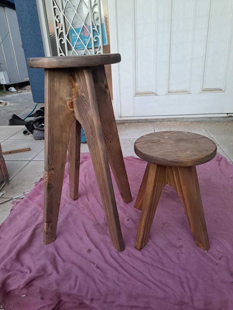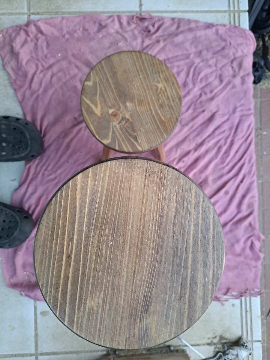 趣味で木工してます。 リクエスト何件か頂いたパパと僕の親子丸椅子を作ってみました。パパの方は高さを45cmで直径19.5cmで僕の方は高さ25.5cmにしてみました。 木材はホームセンターのホワイトウッドです。 仕上げはヴィンテージ家具風にウォールナット色に着色後ウレタン仕上げです。 ※発送前にはガラス面上でガタツキ調整して発送しますが設置環境が変われば多少ガタツキが出るかもしれませんが、その場合にはフェルト等貼り付けで調整してください。 リビング用椅子や フラワースタンドや屋内等インテリアに如何でしょうか? 素人の手作り品で自然素材なので節や割れや傷の埋木パテ埋めや塗装へたくそはありますが、それも手作り感とご理解下さい。依って家具屋さんで見るような高級家具と比較されては困ります。