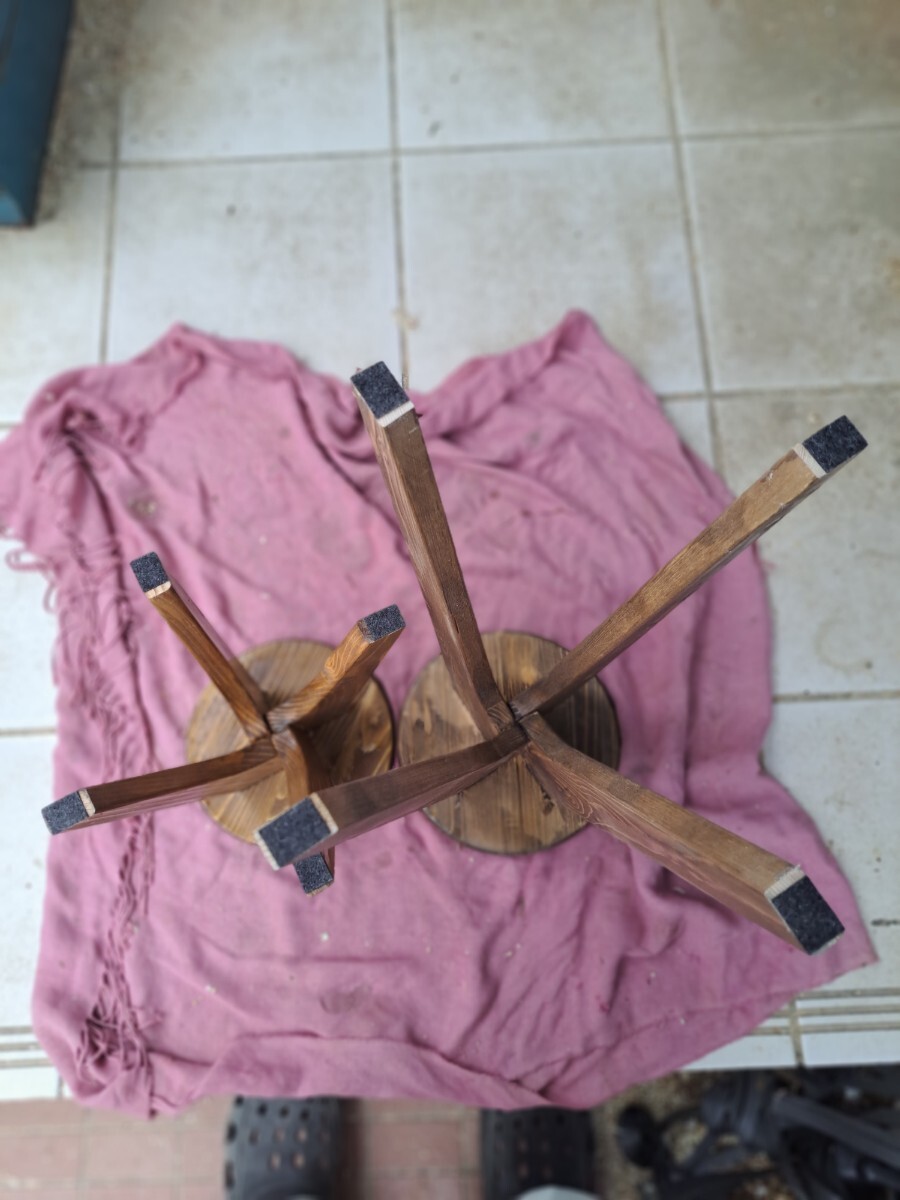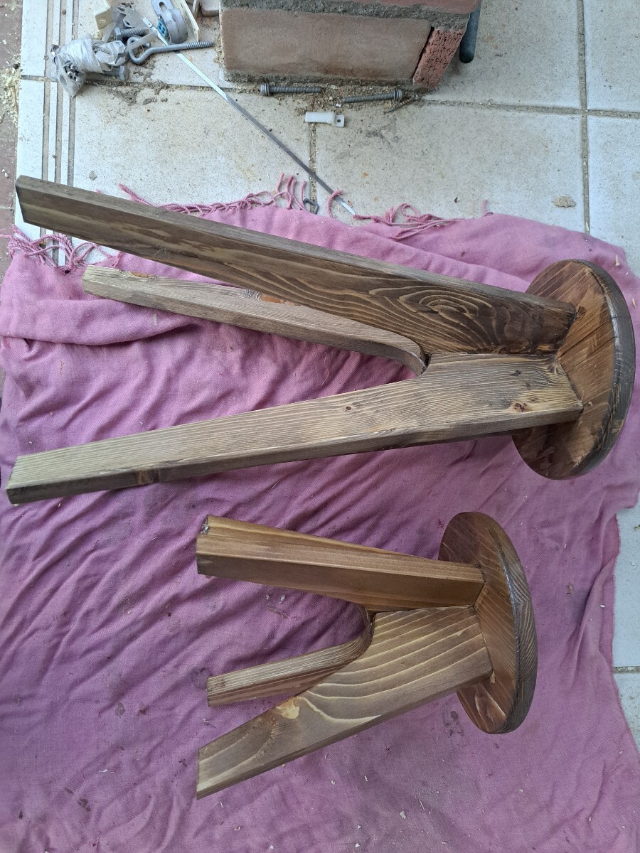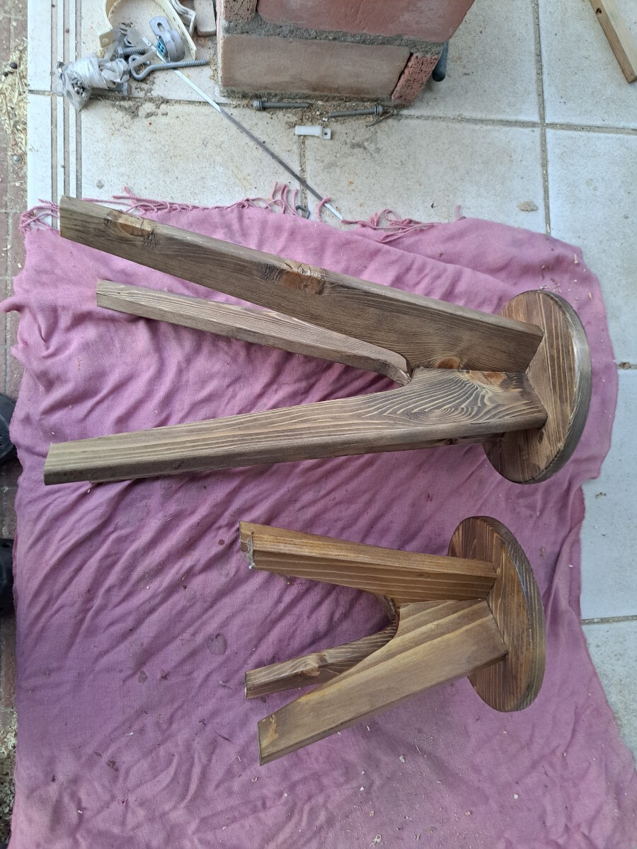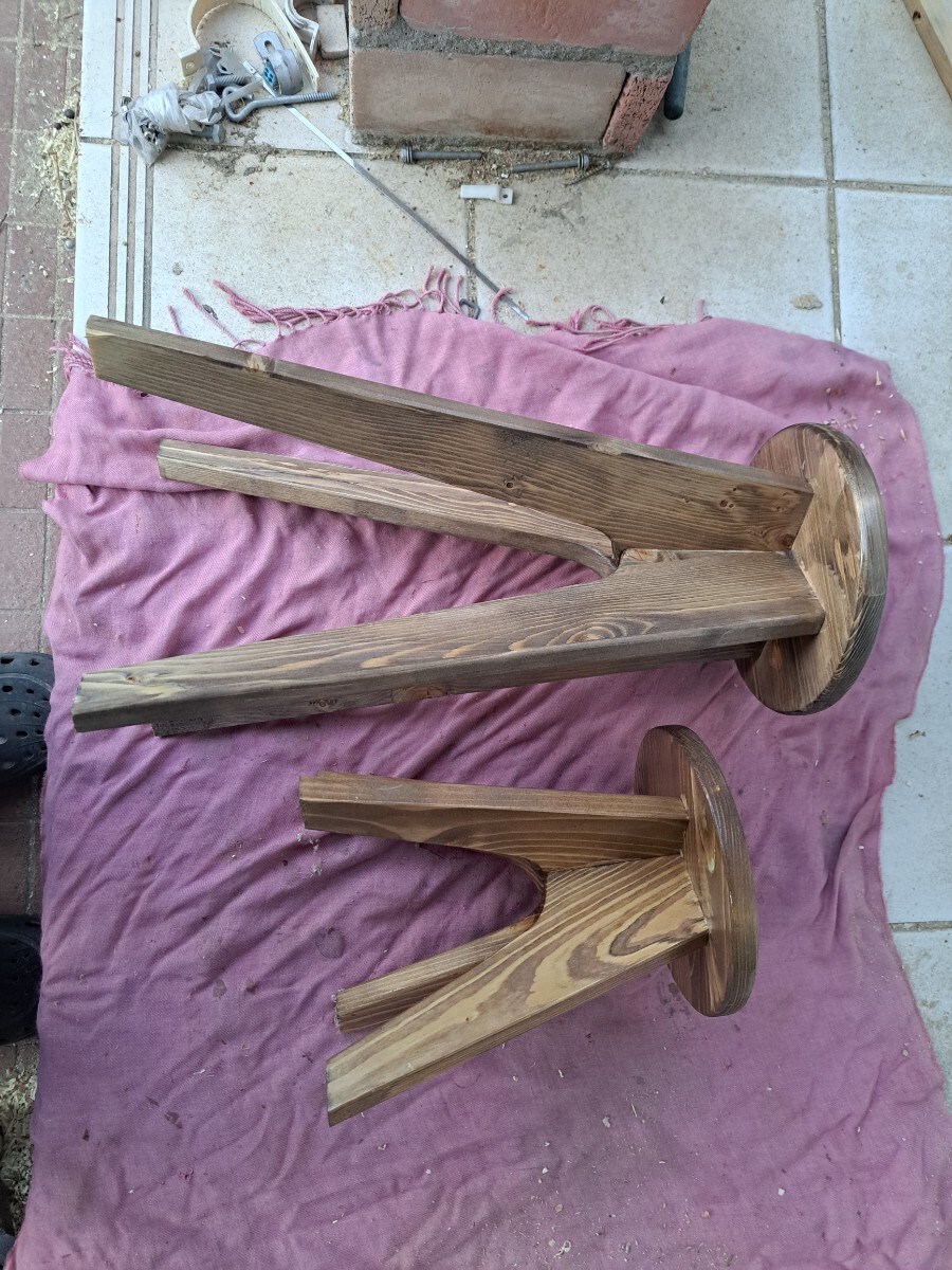 趣味で木工してます。 リクエスト何件か頂いたパパと僕の親子丸椅子を作ってみました。パパの方は高さを45cmで直径19.5cmで僕の方は高さ25.5cmにしてみました。 木材はホームセンターのホワイトウッドです。 仕上げはヴィンテージ家具風にウォールナット色に着色後ウレタン仕上げです。 ※発送前にはガラス面上でガタツキ調整して発送しますが設置環境が変われば多少ガタツキが出るかもしれませんが、その場合にはフェルト等貼り付けで調整してください。 リビング用椅子や フラワースタンドや屋内等インテリアに如何でしょうか? 素人の手作り品で自然素材なので節や割れや傷の埋木パテ埋めや塗装へたくそはありますが、それも手作り感とご理解下さい。依って家具屋さんで見るような高級家具と比較されては困ります。